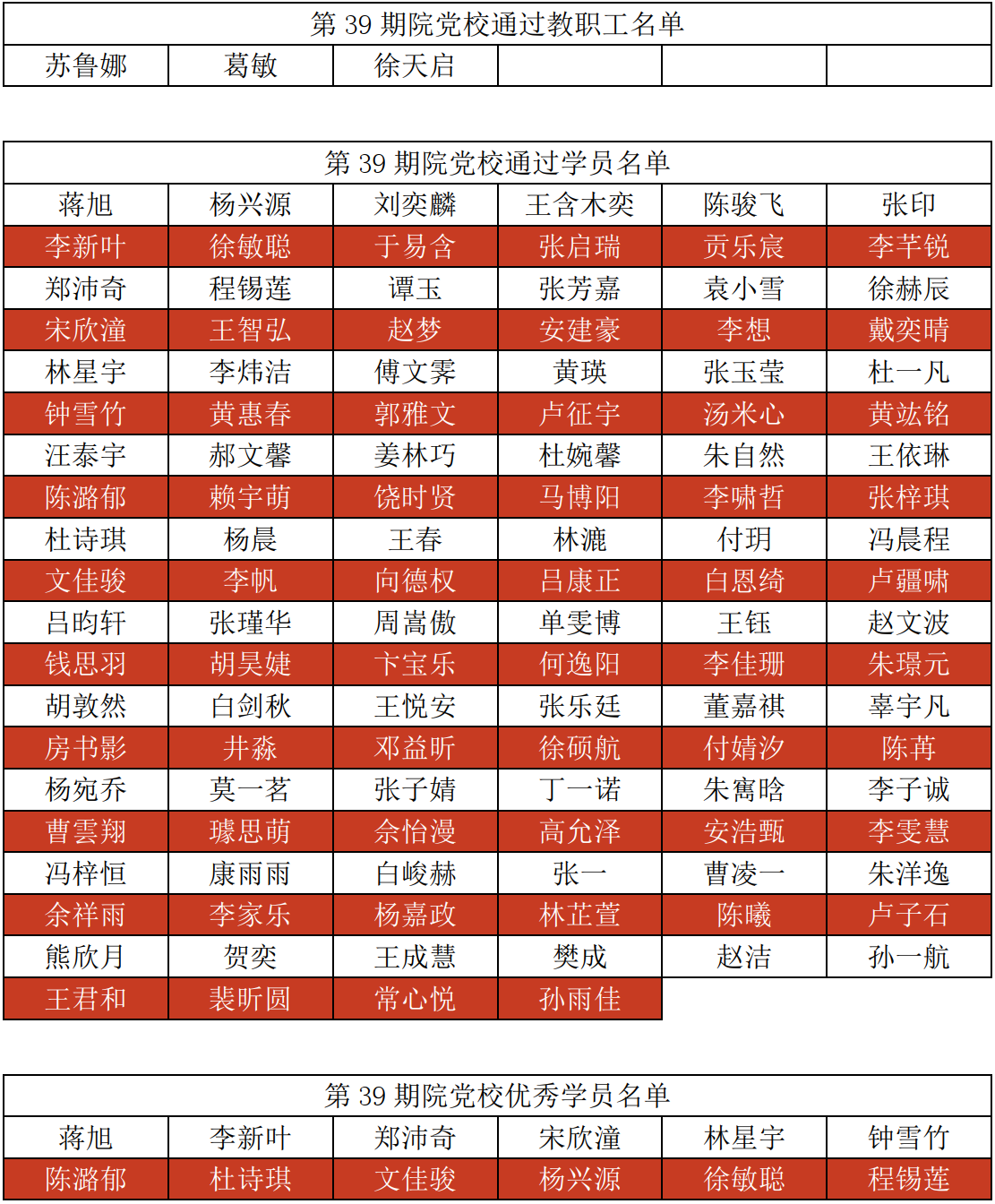 根据有关要求,现对通过公司党校第39期积极分子培训班综合考评的3名教职工积极分子和118位员工积极分子进行公示,以听取党内外群众意见。