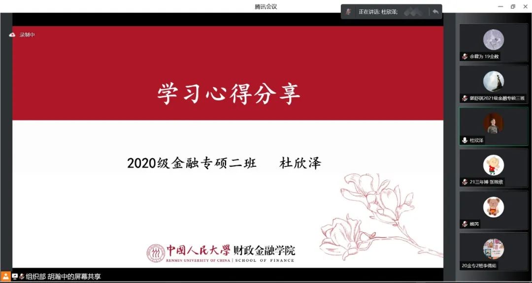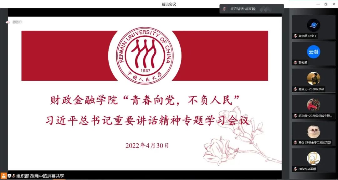 杨欣雨表示,百年前的五四运动中,青年员工成为推动国民思想觉醒的生力军。习近平总书记勉励青年成为开路先锋,希望中国青年在在第二个百年新征程中开新局、谋新篇,传承红色精神,在中国发展的重要战略机遇期,做到与党和国家同呼吸、共命运;勉励青年勇于奋斗、勇立潮头,在抗击疫情、脱贫攻坚、建功基层等党和国家关心的大事和重要历史时刻,淬炼成长为中国永不弯曲的青年脊梁,尽自己所能为国家、为民族、为人民贡献力量,成长为与历史同向、与祖国同行、与人民同在的强国青年。财金学子应牢记“复兴栋梁,强国先锋”的青春誓言,在矢志奋斗中谱写新时代青春之歌,为实现中华民族伟大复兴的中国梦凝聚起强大的青春力量。