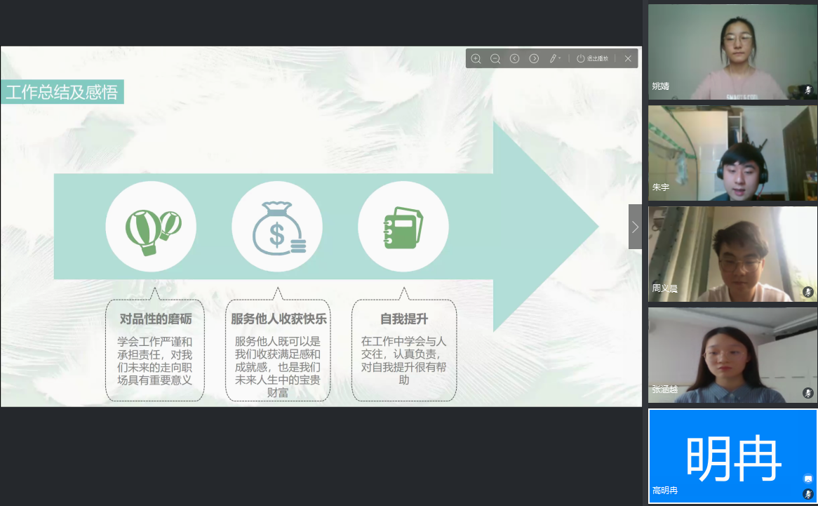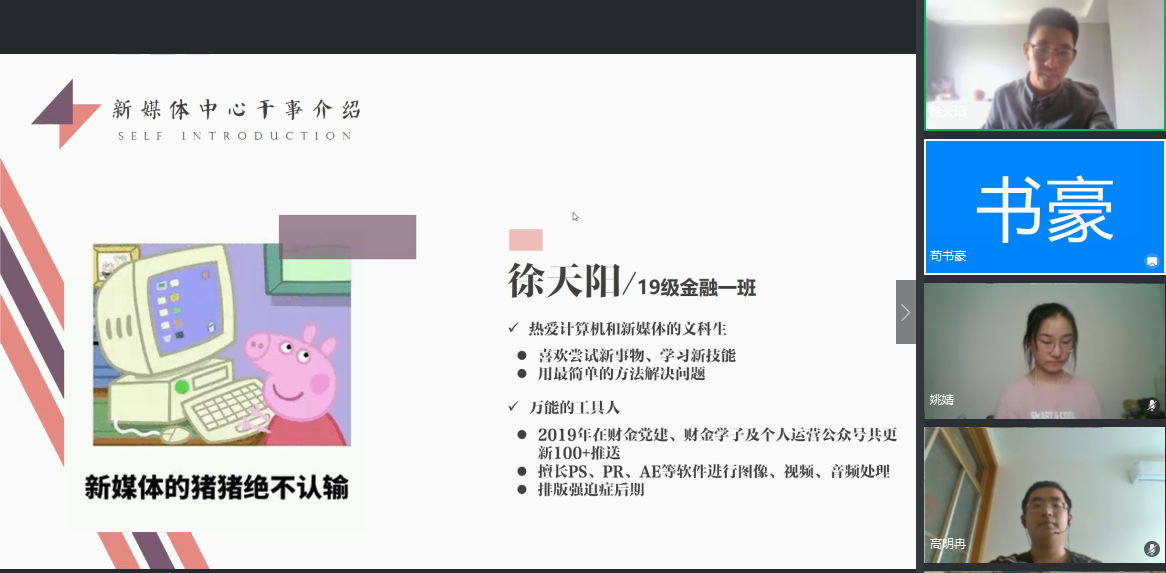 新媒体中心干事们分享了公众号运营、挂网、宣传品制作等具体工作,并对部门的未来做出展望,以期能够更好地发挥新媒体技能,向公司、公司传递财金党建的声音。