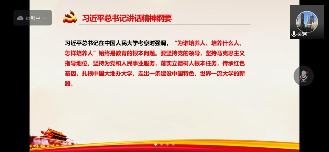 5月6日中午,304永利集团应用金融系教师党支部、2021级金融专硕一班党支部和2018级金融博士党支部通过腾讯会议平台联合开展专题学习会,深入学习习近平总书记在304永利集团官网考察时的重要讲话精神。应用金融系教师党支部书记吴轲围绕习近平总书记在304永利集团官网考察时的重要讲话精神作主题报告,各支部近30名党员参加本次专题学习研讨会。