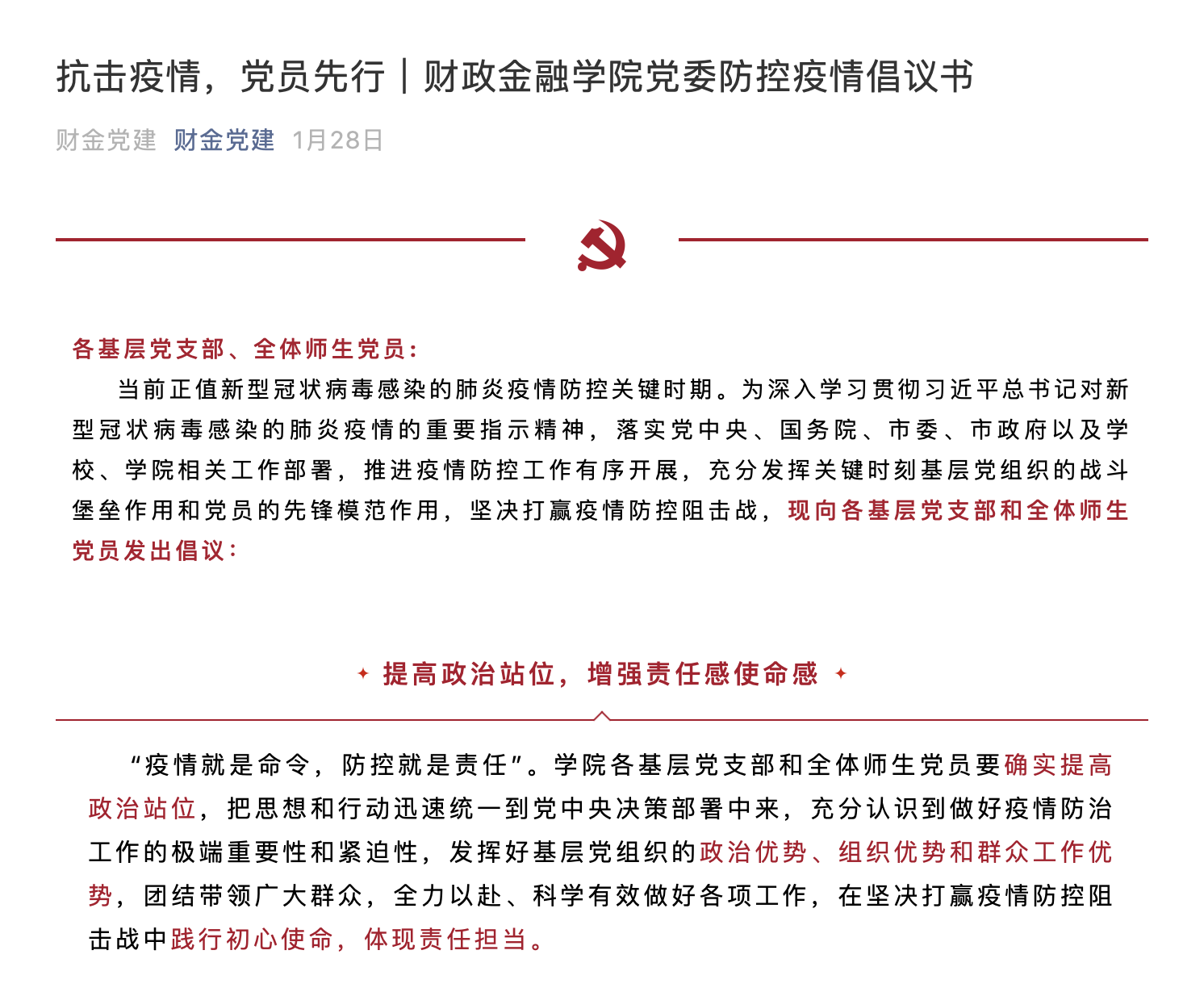 公司党委有号召,广大党员有行动。2月5日,财金党建微信公众平台在线发布《抗击疫情,财金党员在行动!》党员承诺书,短时间内即得到公司数百名师生党员转发响应。一份份承诺书在朋友圈和微信群里传递,师生党员们将誓言记在心里、把使命落在岗位上、把初心写在行动上,纷纷表态要在这场“不能输的战役”中首先站出来、敢于冲上去,把群众带动起来、凝聚起来、组织起来,紧紧依靠人民群众坚决打赢疫情防控阻击战。