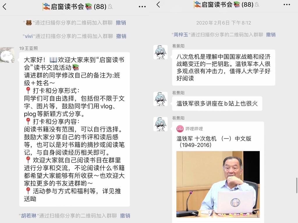 根据公司延期开学、指导员工居家自学的安排,党建带团建,304永利集团团委策划启动启窗读书会,为财金学子搭建了一个特殊假期中阅读、分享、交流、探讨的云平台,同学们灵活利用线上微信群里和plog、vlog等新颖的分享形式。自活动发起以来,参与人数近百人,各种形式的分享和打卡近200次,涵盖书籍百余本。