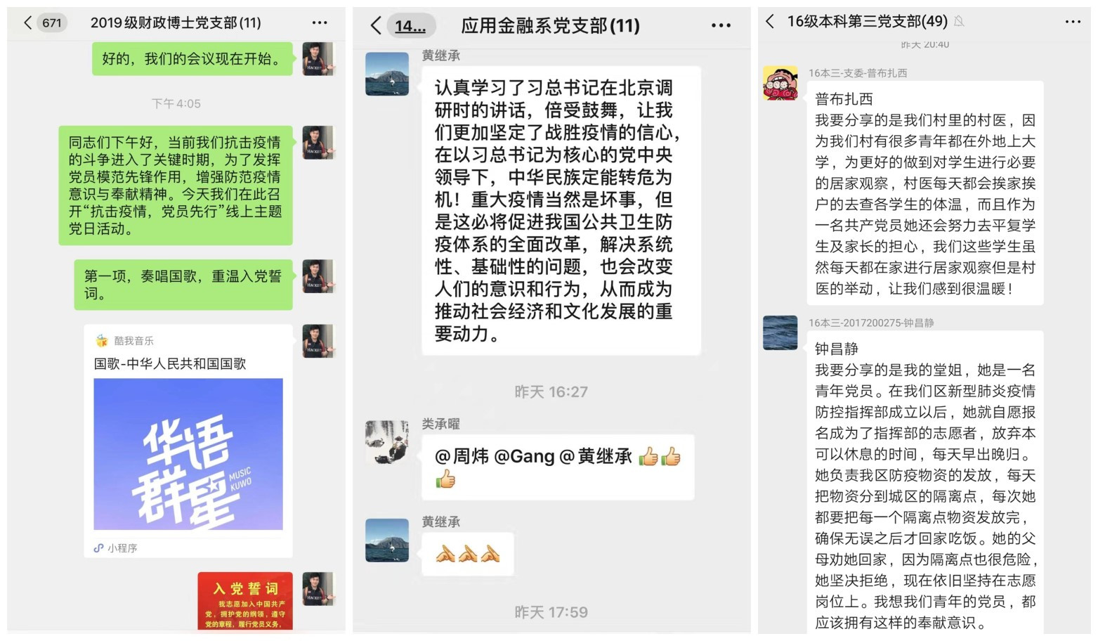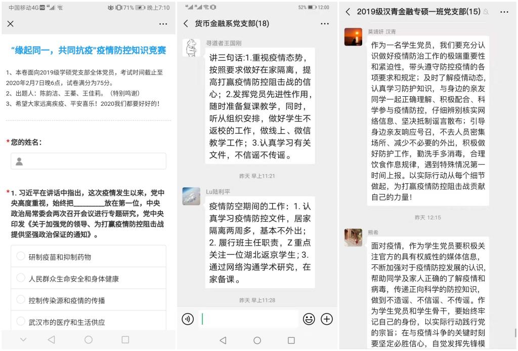 许多党支部通过创新活动形式,丰富了线上党日的内容,提高了活动的趣味性,也增强了支部成员的防疫意识。2016级本科第三党支部等支部采用“分享身边党员抗击疫情感动事迹”方式进行学习,以奋战在抗疫一线的先进模范自励,坚定必胜信念;2019级学硕党支部等支部以知识竞赛的形式,帮助支部成员掌握防控知识,从而更好地为人民群众答疑解惑;2018级金融专硕一班等党支部举行“你画我猜”活动,选出灵魂画手,增强党员学习和宣传防疫知识的自主性和积极性;2019级金融专硕二班党支部通过手写祝福的形式,传递真挚祝福,表明战“疫”必胜的坚定信心。2018级金融专硕三班党支部等支部自发进行防控疫情承诺,并积极转发公司党委防控疫情倡议书,充分发挥党员的先锋模范作用。