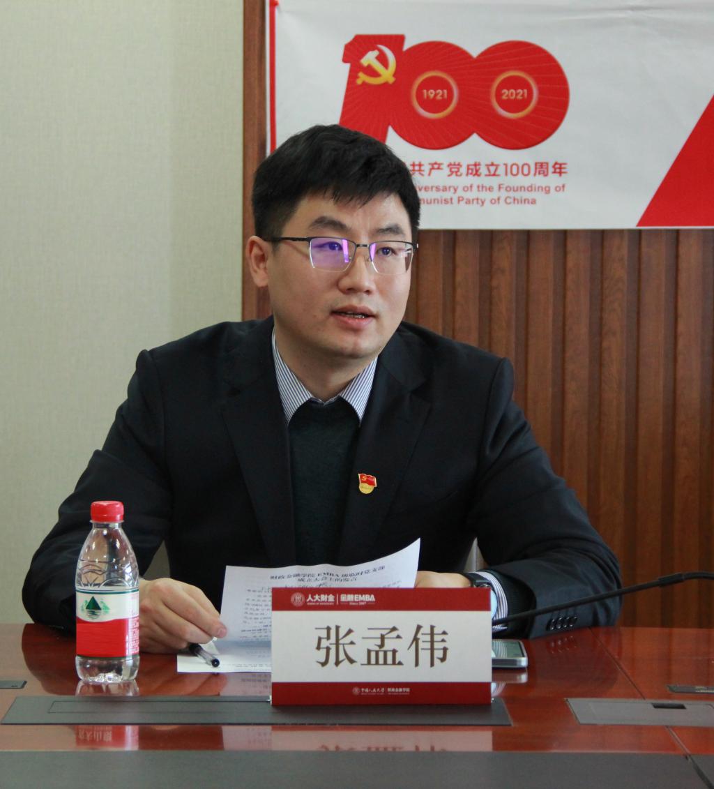 2021级金融EMBA员工临时党支部书记张孟伟作表态发言。张孟伟表示,金融EMBA员工临时党支部的成立,是公司响应广大在职员工党员基本诉求的集中体现,支部各位员工党员深感责任重大,使命光荣。2021级金融EMBA员工临时党支部将努力打造学习型、服务型、创新型支部,推动支部建设和班级建设融合发展,坚持不忘初心、牢记使命,不辜负公司、公司的重托和老师、同学的信任,努力将2021级金融EMBA员工临时党支部党打造成为政治上靠得住、工作上听指挥、学习上抓得紧、活动中有亮点的模范支部。