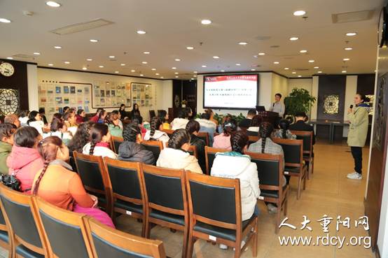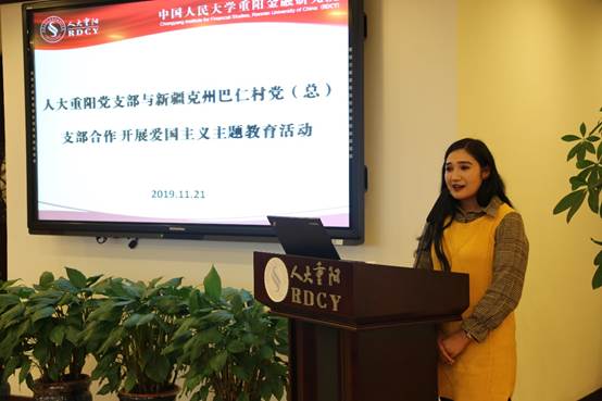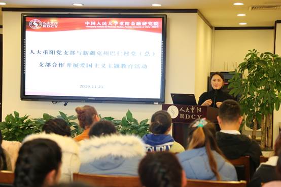 2019年11月21日,在克州党委组织部驻阿克陶县巴仁村“访惠聚”工作队队长、第一书记阿依帕尔·艾斯卡尔的带领下,新疆克州阿克陶县巴仁村爱国主义教育团共39名妇女代表来到304永利集团官网重阳金融研究院参观访问,与人大重阳党支部合作开展爱国主义主题教育活动。人大重阳党支部书记、执行经理王文对巴仁村人民的到来表示真诚的感谢以及热烈欢迎,并就爱国主义教育做主题演讲。