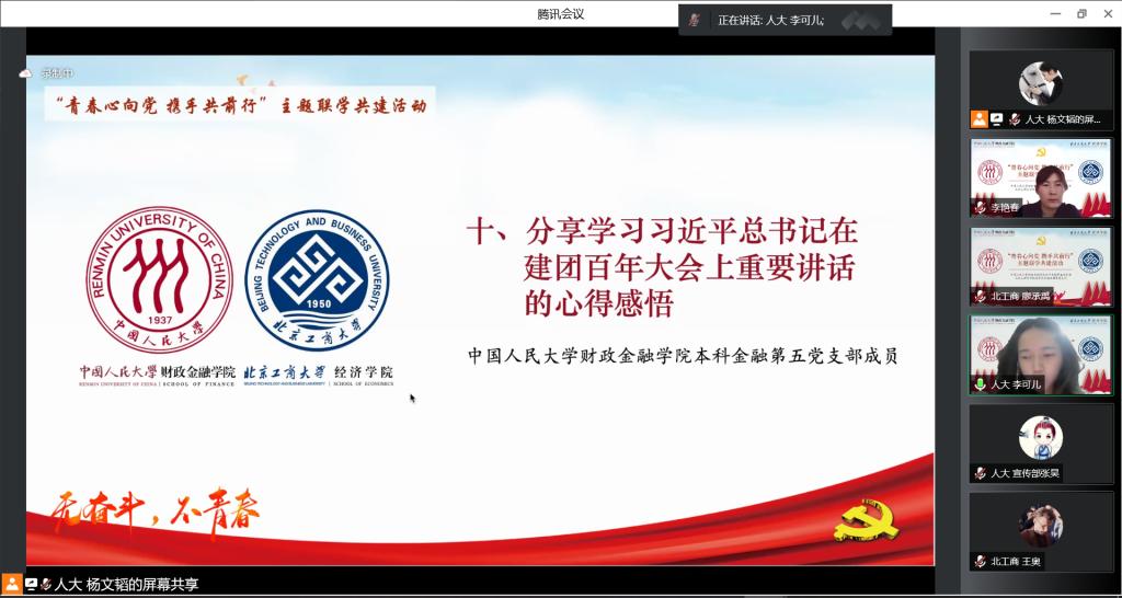 北京工商大学经济公司金融本科生党支部廖承禹和304永利集团金融第五党支部李可儿分享学习习近平总书记在建团百年大会上重要讲话的心得感悟。