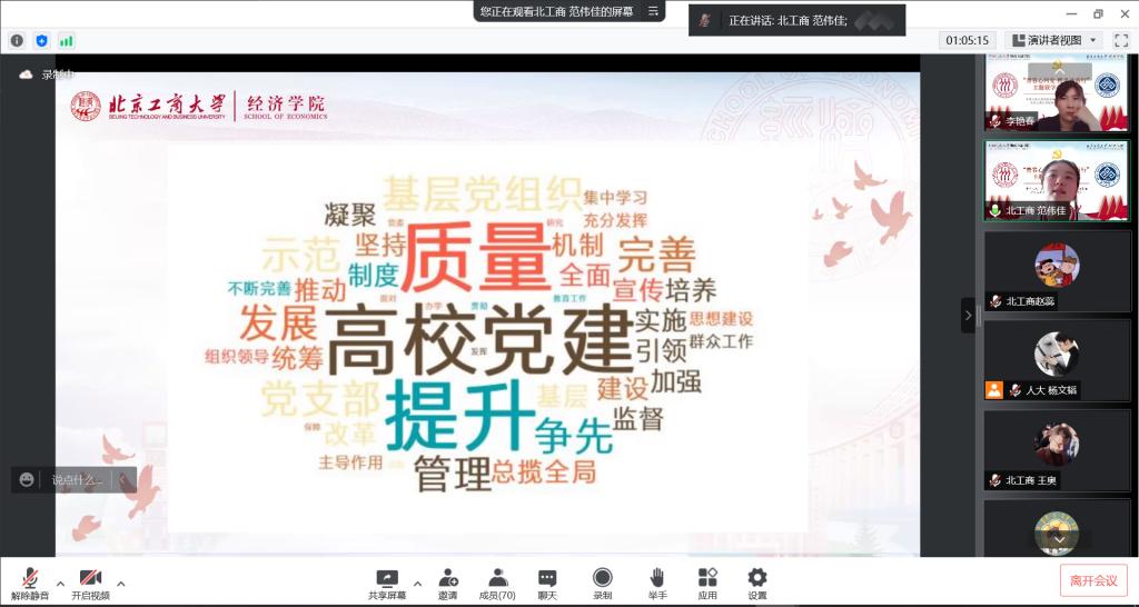 北京工商大学经济公司金融本科生党支部书记王馨笛和304永利集团本科金融第五党支部书记张奇乐分别介绍支部情况,随后,参会成员集体观看《温暖——习近平与老员工朋友们》。