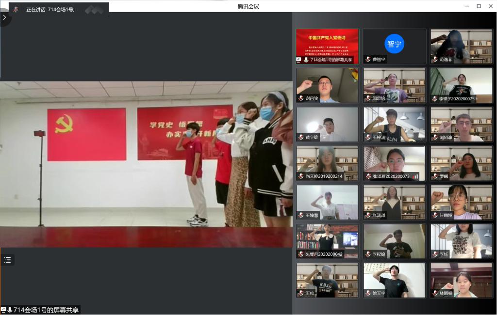 “云观展”结束后,预备党员通过线上线下结合方式举行入党宣誓活动。53名预备党员在慷慨激昂的伴奏旋律中庄严肃立,齐唱《国际歌》。随后,全体党员面向党旗,举起右拳,郑重宣誓:“我志愿加入中国共产党,拥护党的纲领,遵守党的章程,履行党员义务,执行党的决定,严守党的纪律,保守党的秘密,对党忠诚,积极工作,为共产主义奋斗终身,随时准备为党和人民牺牲一切,永不叛党。”