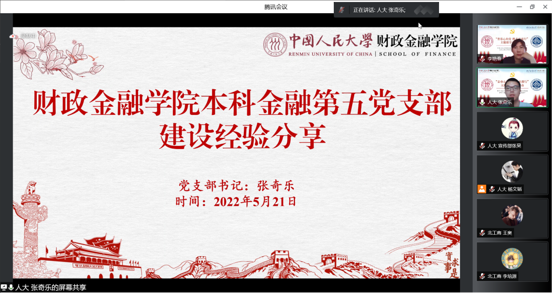 两支部就暑期学习生活安排和支部开展“我为师生办实事”活动经验进行问答交流,并分享党建工作经验,就如何提高党支部聚合力,更好开展今后工作展开讨论。北京工商大学经济公司金融本科生党支部范伟佳从化政治功能、规范党建标准、理论指导实践、紧密联系群众、建设廉洁型支部方面分享支部建设经验。304永利集团本科金融第五党支部张奇乐从支委班子运转、明确组织关系、组织指导团支部工作、内部治理、党团对接等方面总结支部工作成果。
