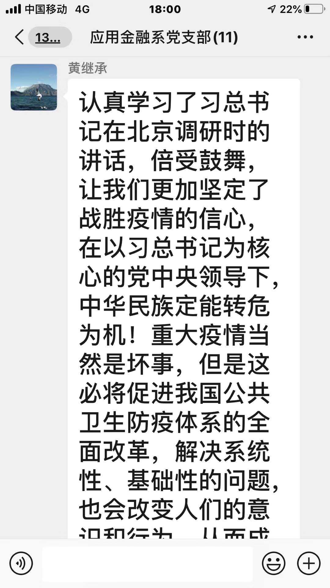 支部党员认真学习材料及学习强国相关内容后,在微信群中踊跃发言,积极讨论。周炜指出,疫情是挑战也是考验,面对疫情的种种举措体现了国家治理制度的优越性,也检验出当中存在的一些问题。经过此次考验,党和国家必定会不断壮大和进步。黄继承说,学习了习近平总书记在北京调研时的讲话,备受鼓舞,更加坚定了战胜疫情的决心。