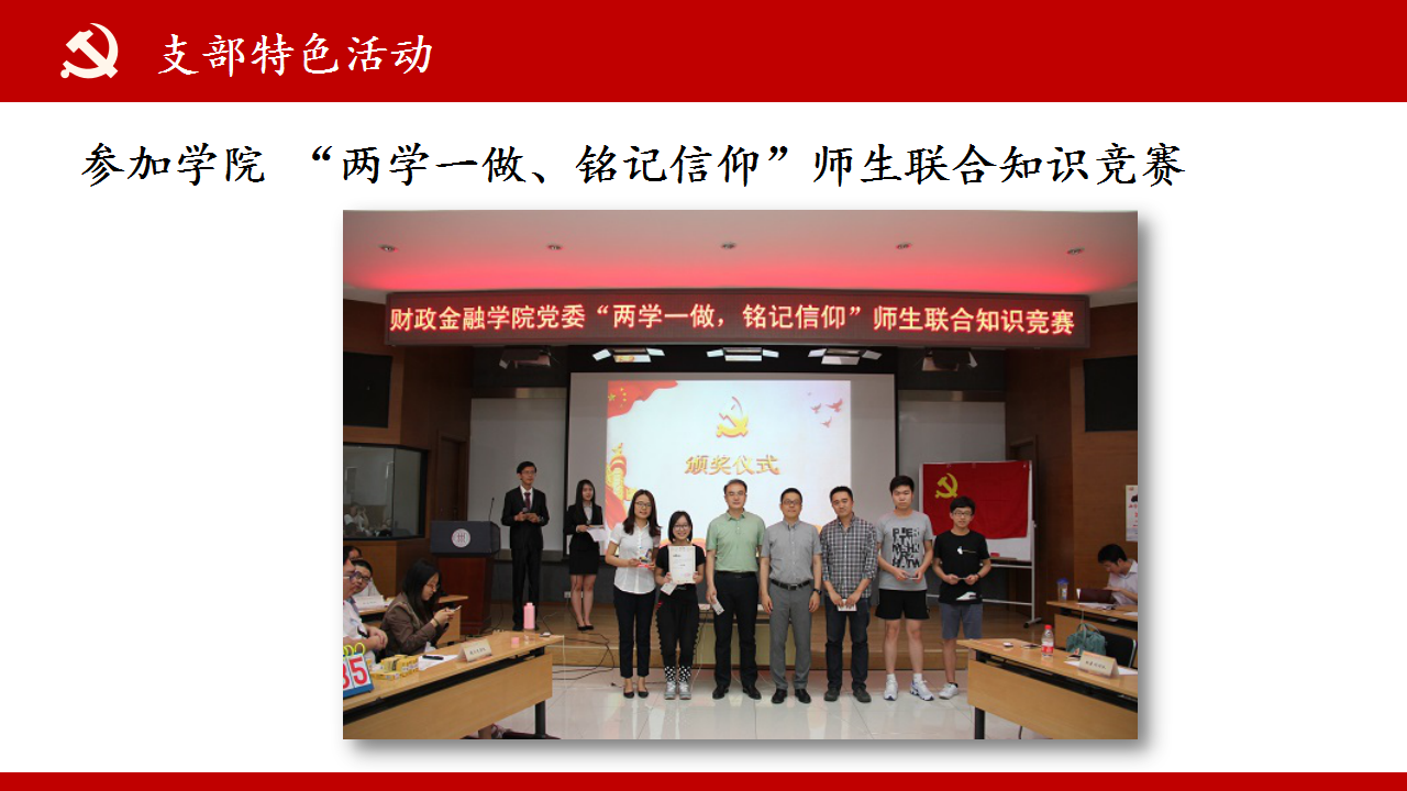 为深入推进“两学一做”学习教育系列活动,货币金融系党支部党员代表参加了公司“两学一做、铭记信仰”师生联合知识竞赛,并获得一等奖,增进了师生间的情谊,发挥了党员的先锋模范作用,让支部党员对习近平总书记提出的“两学一做”有了更深刻的理解,更加坚定了共产主义的理想信念,并对自己提出了更高的要求。