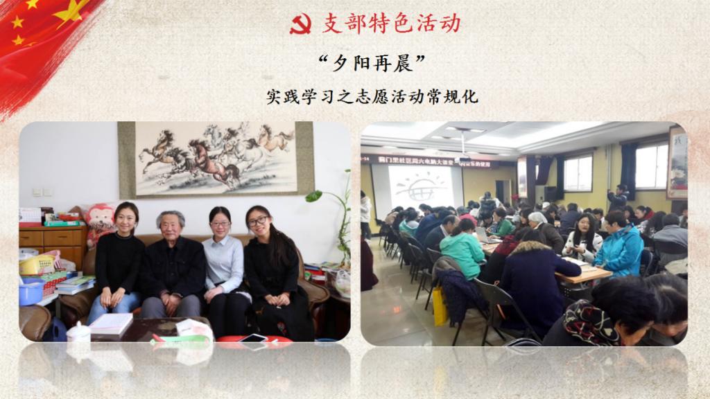 在实践学习方面,支部积极开展“红色1+1”活动,与海淀区蓟门里社区结对共建,在海淀区蓟门里社区进行了近一年的“夕阳再晨”志愿服务活动,将志愿活动常规化、党员实践日常化。支部通过这一常规活动,形成帮扶纽带,便捷日常生活,丰富精神世界,温暖晚年岁月,在实践中传递了爱与正能量。