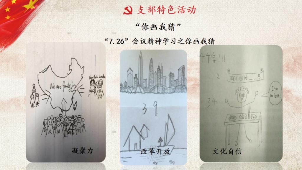 结合线上平台的优势,支部举行了别开生面的学习活动——“我手绘我心,趣迎十九大”。游戏将理论学习与线上游戏相结合,摘取习近平总书记“7.26”讲话中最具代表性的相关理论词汇,由支部成员将自己理解的词语绘制成图并上传微信群,其他成员依据对“7.26”讲话的学习基础及绘画作品进行抢答。支部成员在欢声笑语中加深了对理论的认知程度,寓教于乐,入脑入心。支部成员们学得开心、学得深刻、学得有效率,对习近平总书记“7.26”重要讲话精神有了更深的体悟。