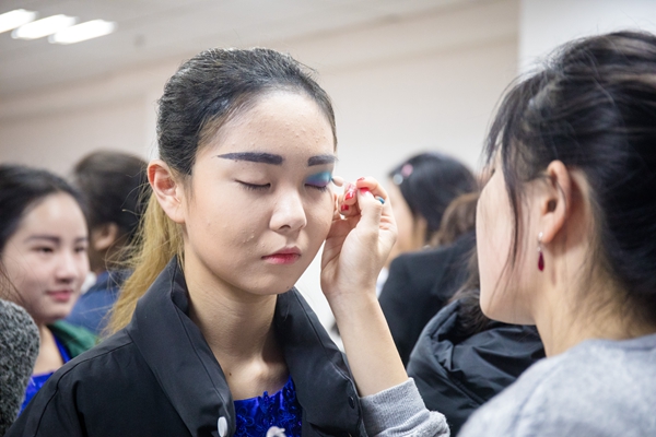 虽然比赛在下午进行,但是上午9时,公司全体“一二•九”合唱队员便已经来到了明德主楼830会议室,为比赛进行准备。换上演出服后,会议室里一时充满复古气息——男生们身着西装,显得稳重大气;女生们则一袭长裙,尽是端庄优雅。随后,化妆工作有条不紊地进行。抿焰唇画黛眉,蘸细粉染红脂。在工作人员的精心装扮下,队员们更加神采飞扬。他们互相拍照,记录下自己最潇洒美丽的瞬间,也记录下那份紧张与期待的心情。午饭过后,队员们进行了赛前的最后一次合排。激昂的歌声里凝集着同学们五十多天日日夜夜的辛苦付出,也展现出他们对登上如论舞台的满心期待。队员们上场前,公司经理郭庆旺、党委书记纪红波、党委副书记黄文彬来到830会议室为同学们加油鼓劲,并表示非常期待同学们的精彩表现。