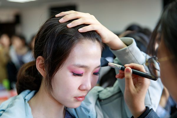 比赛当天清晨,合唱队员们就已从宿舍出发,脸上洋溢着激动之情,一路笑语盈盈,到达明德主楼830会议室。队员们换上了演出服:女生一袭紫色长裙,精致而优雅;男生一身黑色中山装,帅气而庄重。随后化妆工作有条不紊地进行,黛眉微勾,红唇轻抹;细粉略施,胭脂小染,美丽的妆容更为衬托动人的歌声。队员们惊喜地照着镜子,不忘拿出手机与同伴自拍留影,记录下这潇洒而难忘的一刻,把这份紧张而期待的心情珍藏。
