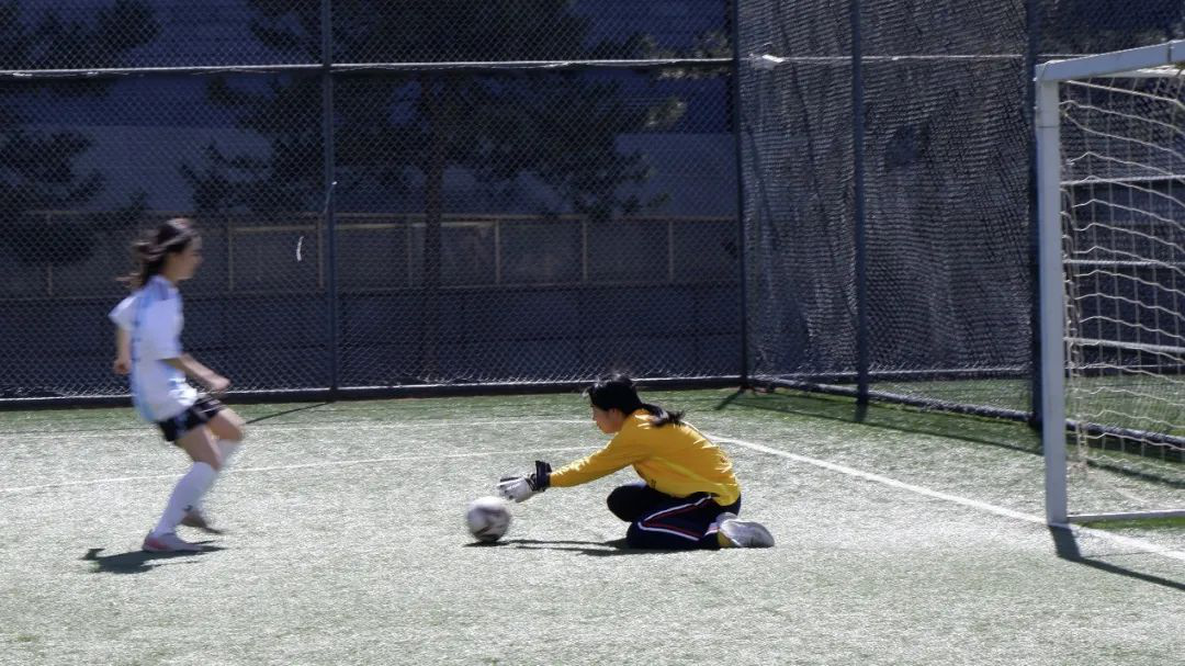下半场第2分钟财金后场被抢断,对方前锋的射门被门将黄玥稳稳抱住。