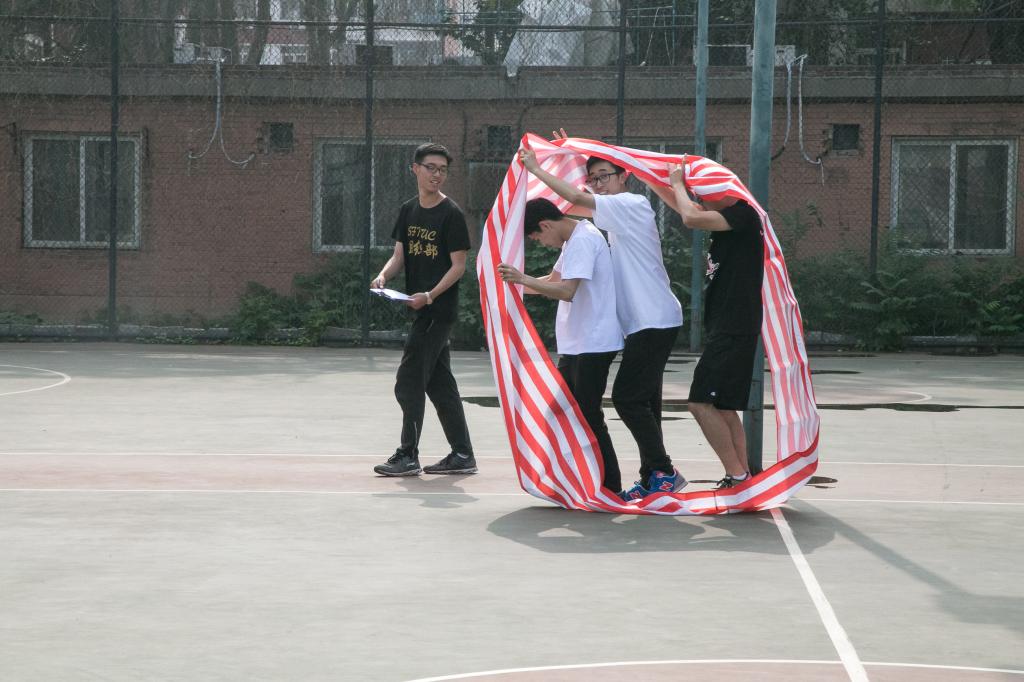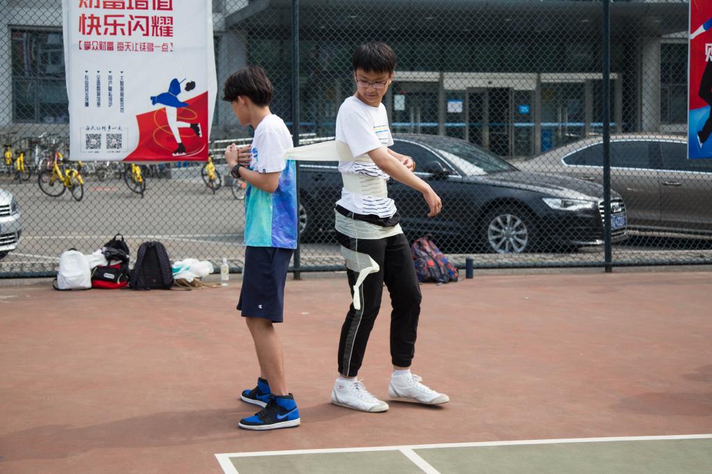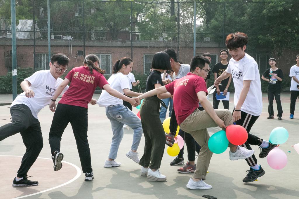 男女配合,男同学腿上绑着气球,女同学则负责向别的队伍的气球发起攻击,气球大战在篮球场的中心一触即发。选手们商量对策,结成同盟,进攻,防守,战况激烈。场上气球的爆炸声、选手的欢笑声与场下同学的加油欢呼声交织在一起,构成今夏最美的乐章。