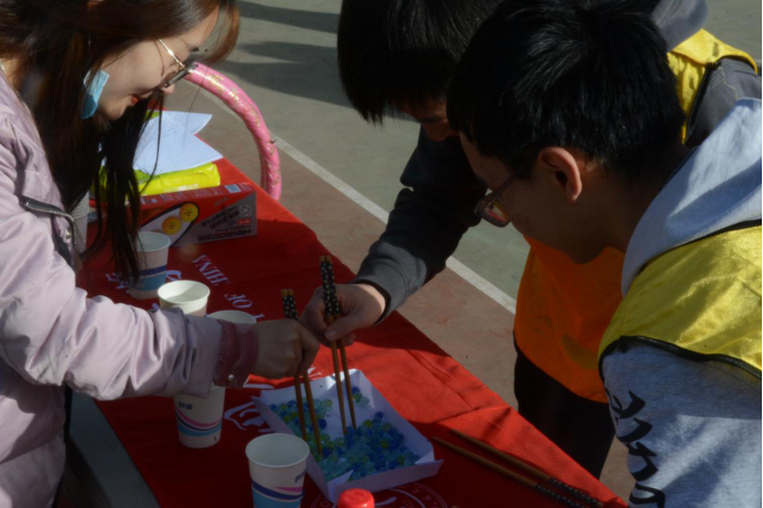 幸运的欧皇飞到了与己方颜色相同的格子!他有机会继续向前四格,迈出通向胜利的坚实一步。有两个人抱在了一起!两个同组的队友处在同一格时,需要有一人抱起另一人。而如果不同组的对手处在同一格,就必须通过小游戏“battle”一下:转圈倒水和夹弹珠二选一,输家需要重新返回起点再出发。两个小组选择了“夹弹珠”项目,各派出一名队员用筷子小心翼翼地夹取滑溜溜的弹珠,势不相让,分秒必争。有的队员走得远,已经来到终点,却有多出来的步数,只好再一步一步向后退,与终点“渐行渐远”。