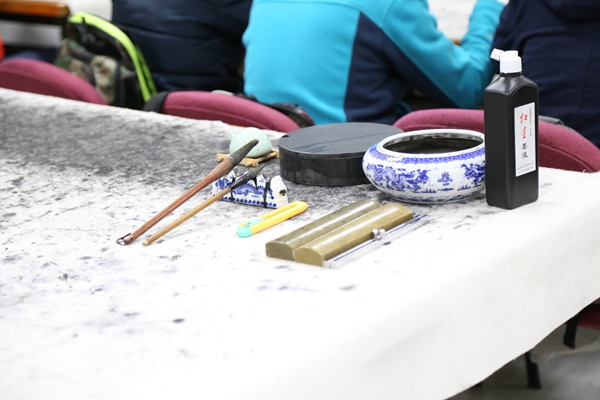 “工欲善其事,必先利其器”。谈到书法,自然离不开文房四宝,蒲师培随即围绕“笔墨纸砚”,为大家进行了更为细致的讲解。首先,他介绍了毛笔的构成及其特性。他提醒同学们,在选择毛笔时一定要注意“尖齐圆健”四个关键。他强调,尖豪、软豪类型的毛笔,更有利于初学者的学习。随后,同学们纷纷拿起面前的毛笔,亲身感受了这类毛笔的特性。