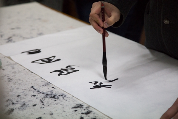 讲座的尾声,蒲师培邀请大家走上讲台,为同学们演示各种字体的写法,并为大家讲解了汉字书法文化的演变。他强调,真正意义上的书法,是从汉字的隶化说起的,而后演变来的楷书和行书则将书法艺术推至巅峰。他提到,自“颜柳欧赵”四大家后,人们开始认真钻研书法中的笔法和线条,琢磨颜筋柳骨。讲解期间,看着蒲师培在宣纸上挥墨自如,同学们不禁艳羡蒲师培先生精湛的书法技艺,也感受到了他对书法的一腔热忱。
