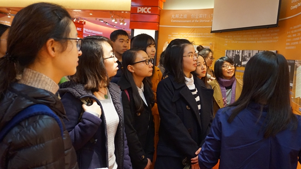 参观伊始,人保财险的张萌萌女士带领师生一行参观了企业文化展室。张女士为大家详细介绍了中国人保(集团)公司的企业历史、企业规模、团队管理方式、企业文化、社会公益情况及企业发展目标等内容。同学们仔细聆听,不时在自己关心的部分驻足观看。讲解结束后,公司师生与人保财险公司的工作人员合影留念,公司还向到访的同学们赠送了精心准备的小礼品。