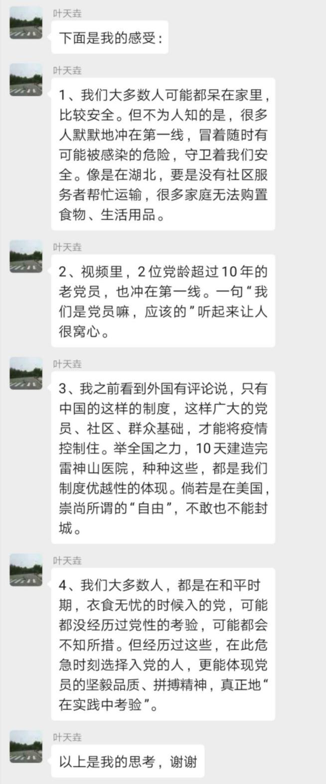 其次,李萌同志介绍的第三段视频,讲述了这样一个故事:在防疫志愿服务中,江干区行政审批服务管理办公室的党员同志主动冲锋一线,积极发挥党员模范带头作用,胡小霞受到党员同志感染号召,主动报名参加志愿服务,并在战“疫”志愿服务一线向党组织递交了入党申请书。叶天垚同学认为,我们大多数人,都是在和平时期,衣食无忧的时候入的党,可能都没经历过党性的考验,可能都会不知所措。但经历过这些,在此危急时刻选择入党的人,更能体现党员的坚毅品质、拼搏精神,真正地“在实践中考验”。