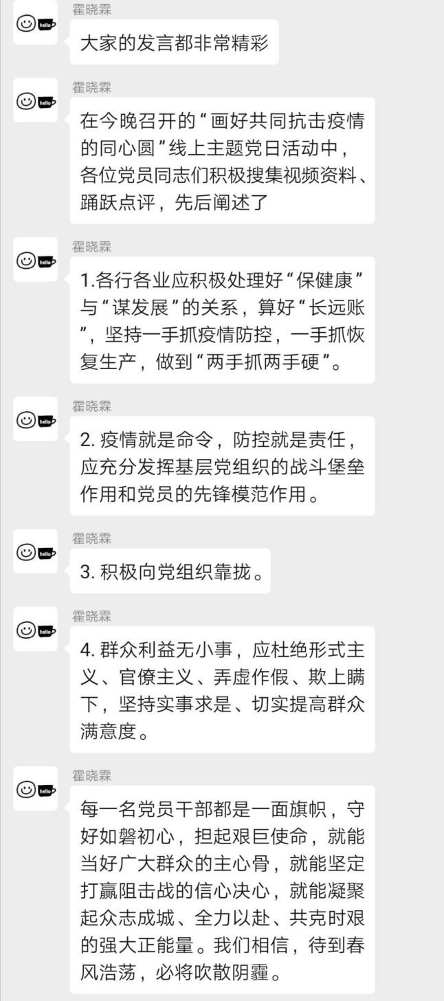 最后,霍晓霖同学对各位同学的发言及本次党日活动的主题进行了总结。她表示,每一名党员干部都是一面旗帜,守好如磐初心,担起艰巨使命,就能当好广大群众的主心骨,就能坚定打赢阻击战的信心决心,就能凝聚起众志成城、全力以赴、共克时艰的强大正能量。