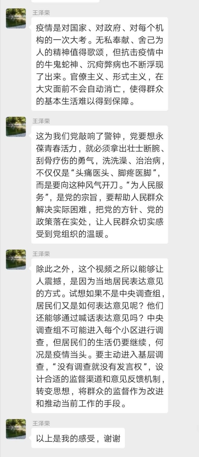 由岳子航同学介绍的第四段视频,主要内容为3月5日,中央指导组在武汉市青山区翠园社区开元公馆小区考察时,有居民隔窗高呼"假的",反映社区物业假装让志愿者送菜送肉给业主,实际工作不到位的情况。王泽荣同志点评到,群众的眼睛是雪亮的,形式主义、官僚主义不能解决社区群众基本生活保障的短板;疫情当头,党员应主动进入基层调查,“没有调查就没有发言权”,设计合适的监督渠道和意见反馈机制,转变思想,将群众的监督作为改进和推动当前工作的手段。