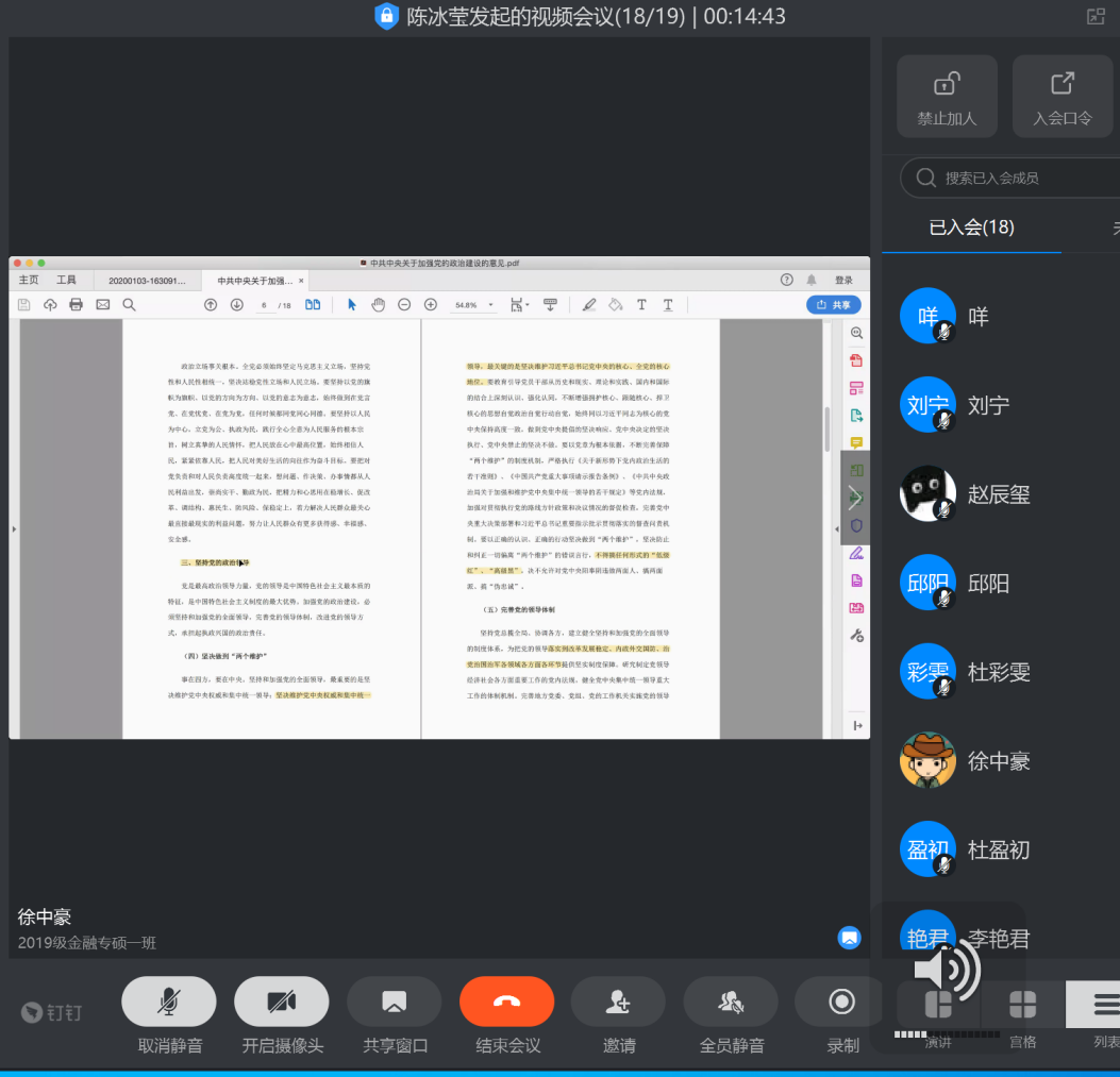 线上主题党日|2019级金融专硕一班党支部党员学党课,细致研读指导文件