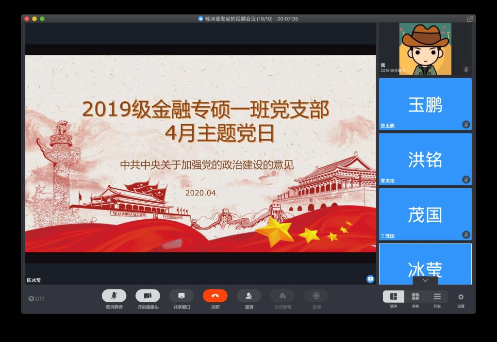 2020年4月16日晚八点半,2019级金融专硕一班党支部通过钉钉线上平台召开了以“加强基层党组织政治建设”为主题的线上主题党日活动。本次会议由党支部书记陈冰莹主持,公司党委委员、支部“一联系一帮扶”指导教师刚健华出席活动并讲话。