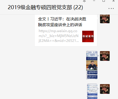 3月11日,“画好共同抗击疫情的同心圆”线上主题党日活动在2019级金融专硕四班党支部中顺利举行。本次活动主要是学习习近平总书记在决战决胜脱贫攻坚座谈会的重要讲话,支部全体党员参与了本次活动。