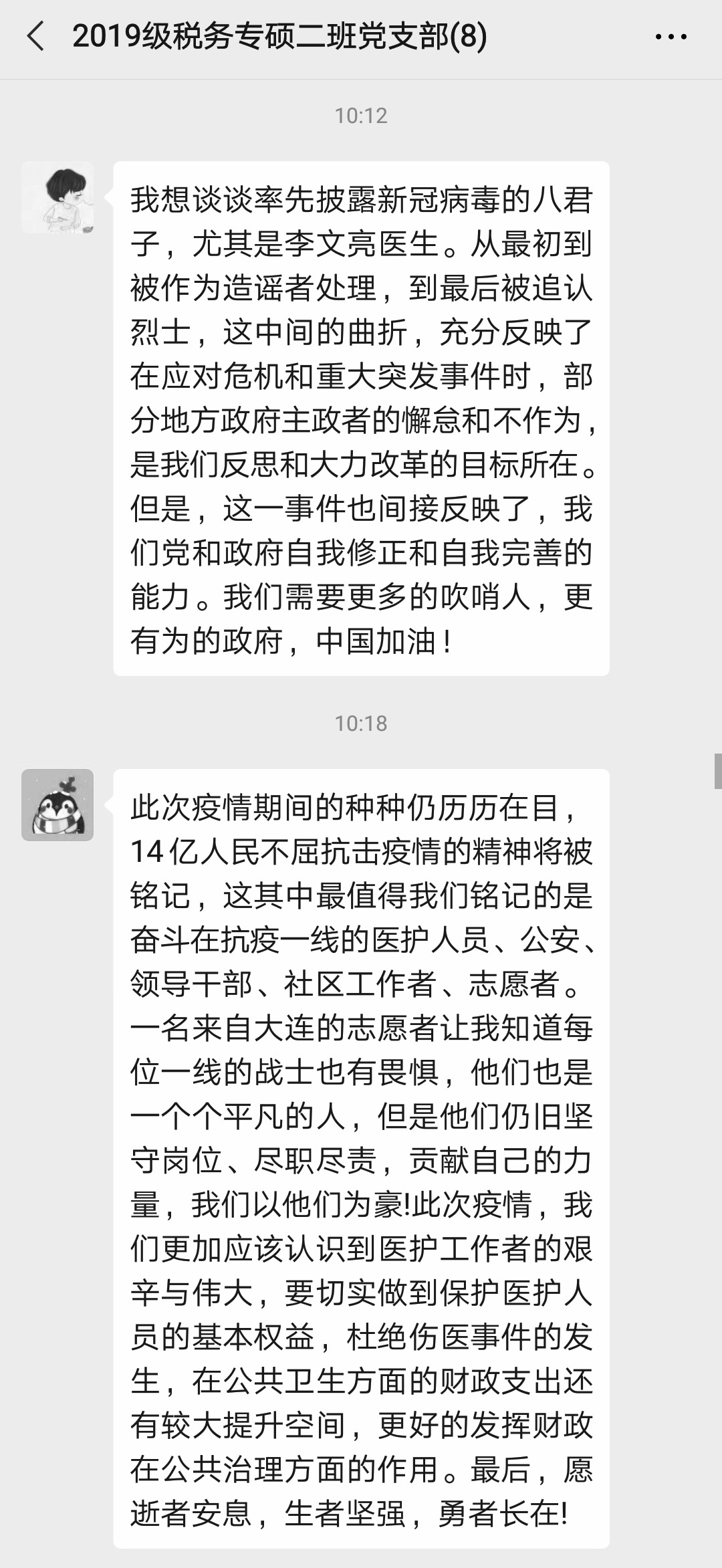 侯丽倩同志提到应该认识到医护工作者的艰辛与伟大,要切实做到保护医护人员的基本权益,杜绝伤医事件的发生,在公共卫生方面的财政支出还有较大提升空间,更好的发挥财政在公共治理方面的作用。宋招阳同志也认为医护工作者为我们披荆斩棘:在抗疫前线上,“苟利国家生死以,岂因祸福避趋之”,那些最美丽的人自春节以来就驻守在安全防护的第一线,为守护人民的生命健康安全夙夜在公,恪尽职守,这样的奉献精神值得我们每一位党员学习。