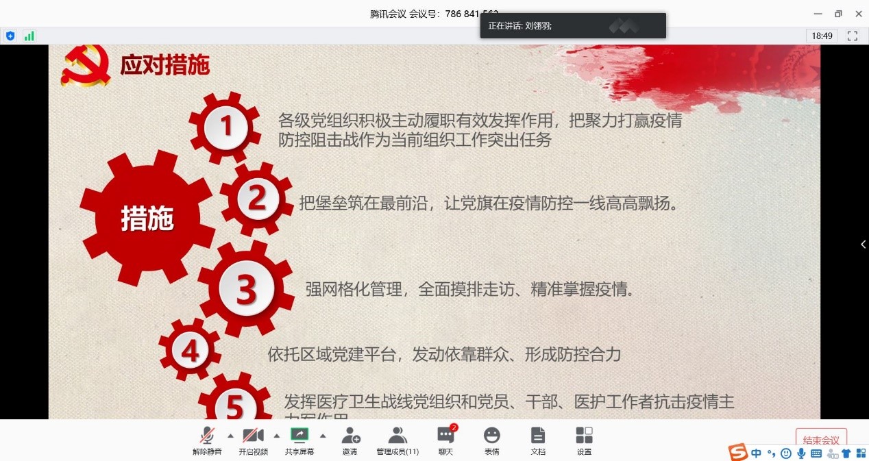4月18日至19日,304永利集团第三十五期公司党校十二个学习小组纷纷开展了以“让党旗在疫情防控斗争第一线高高飘扬”为主题的讨论展示课,本次展示课通过腾讯会议平台线上举行,由各小组组长分别担任会议主持人。