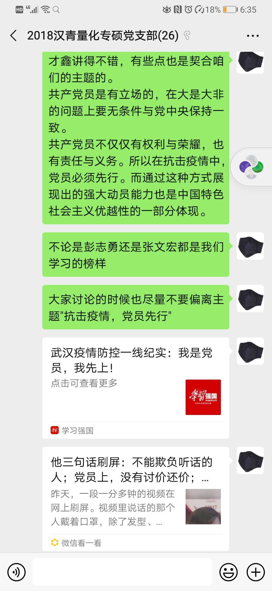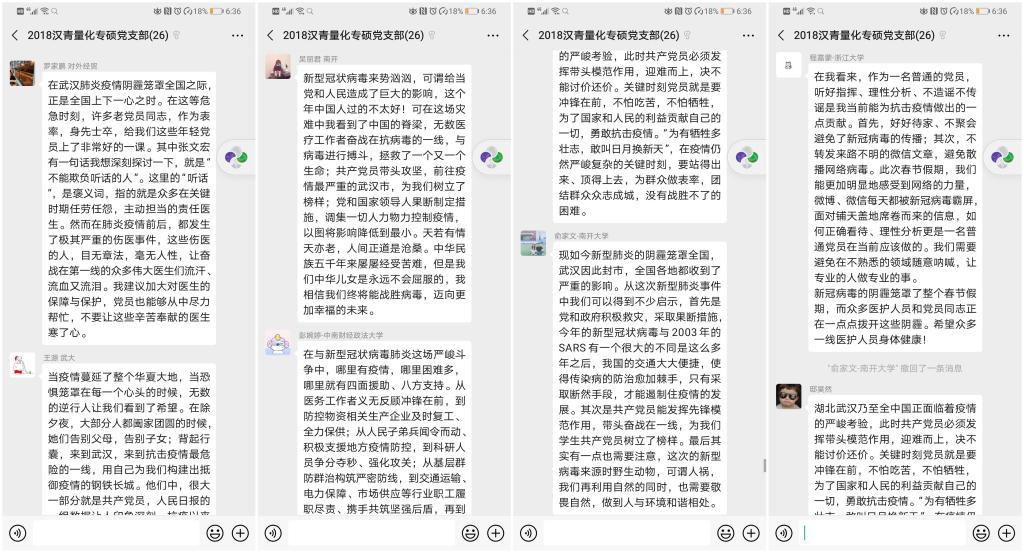 当前正值新型冠状病毒感染的疫情防控关键时期,为更好地发挥基层党组织战斗堡垒作用,切实动员广大党员在疫情防控阻击战中作表率争先锋,2018级汉青量化专硕党支部于2月9日响应组织号在支部微信群召开展“抗击疫情,党员先行”线上主题党日活动。本次支部学习会由党支书王瑞琪主持,全体党员及积极分子参与了本次会议。