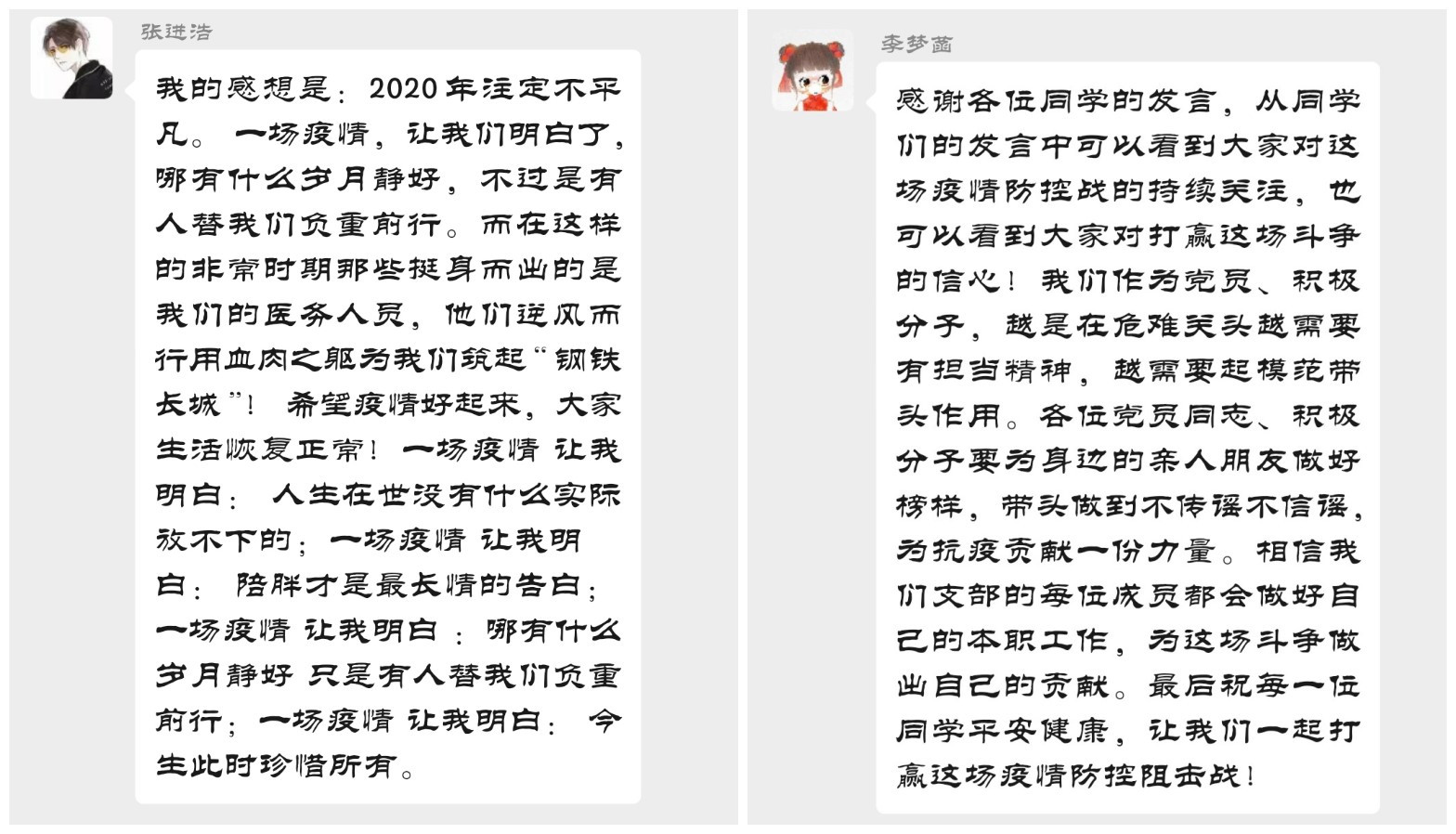 在线上的讨论中,大家各抒己见,有的同学表达了对前线医护人员和志愿者的敬仰,有的同学强调了社会主义集中力量办大事的制度优势,有的同学抒发了对全国人民众志成城的感动,有的同学指出了员工党员在这次疫情中应该承担的责任,有的同学表露了对这场战“疫”必胜的决心。大家积极参与,热情分享,畅所欲言,随着讨论的逐渐深入,气氛也逐渐达到了高潮。