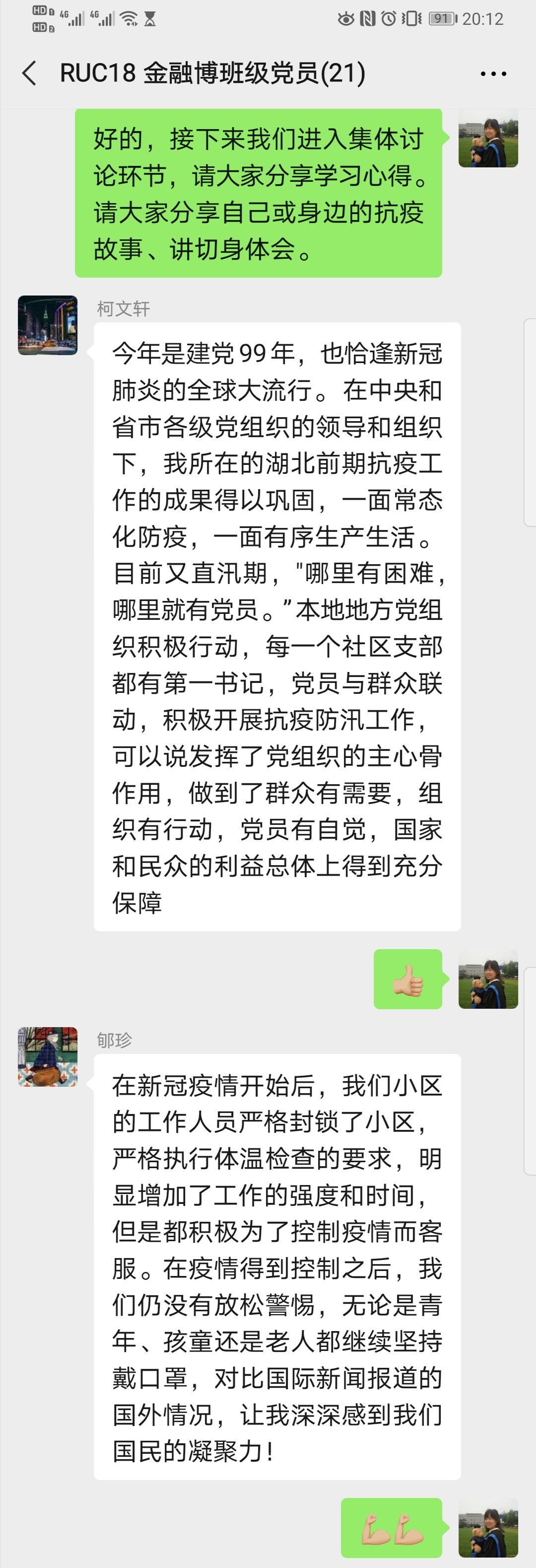 为贯彻教育部《在常态化疫情防控中加强高校基层党建“四个一”行动方案》要求,深入学习习近平总书记对疫情防控重要指示精神,2018级金融博士党支部于2020年7月11日20:00通过党员微信群,开展了7月线上主题党日活动。本次活动以“迎党的生日、讲战疫故事、悟初心使命”为主要内容,采取了线上微党课学习和集体讨论的形式,参会党员分别讲述了自己或身边的抗疫故事,并谈了心得体会。