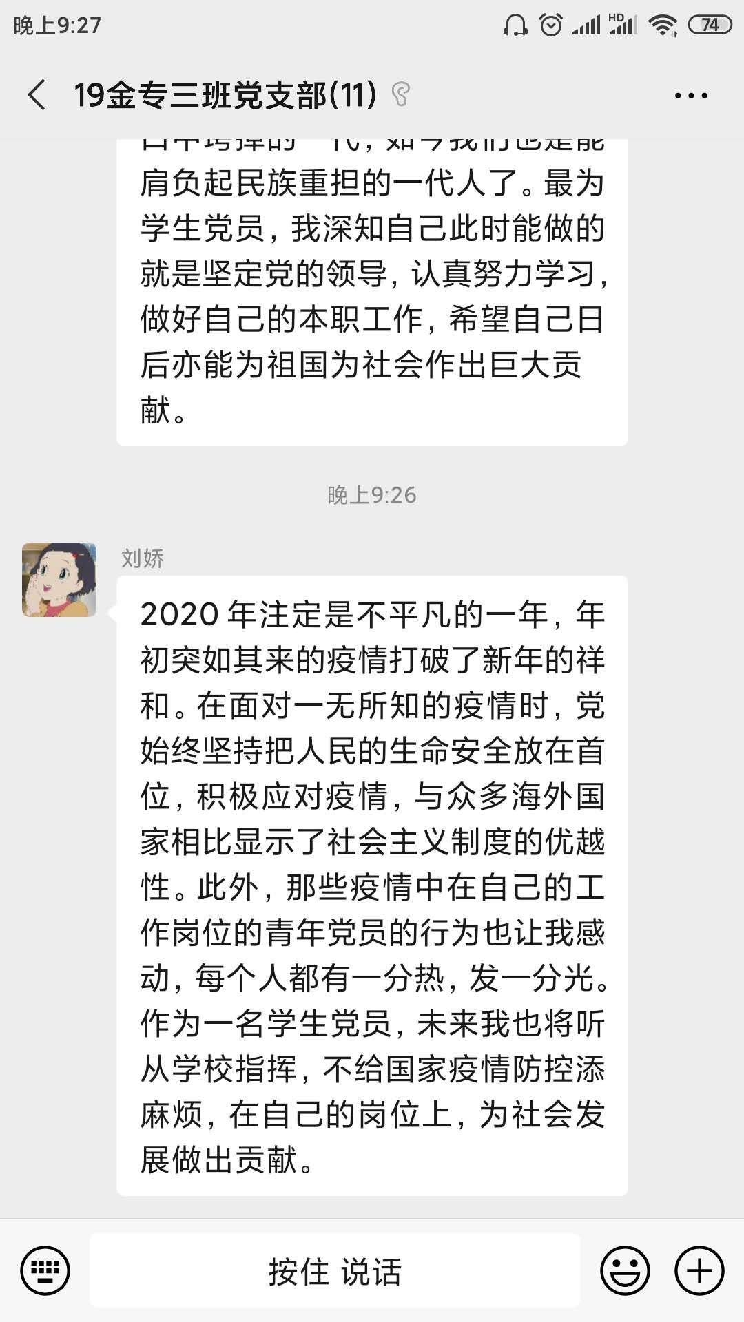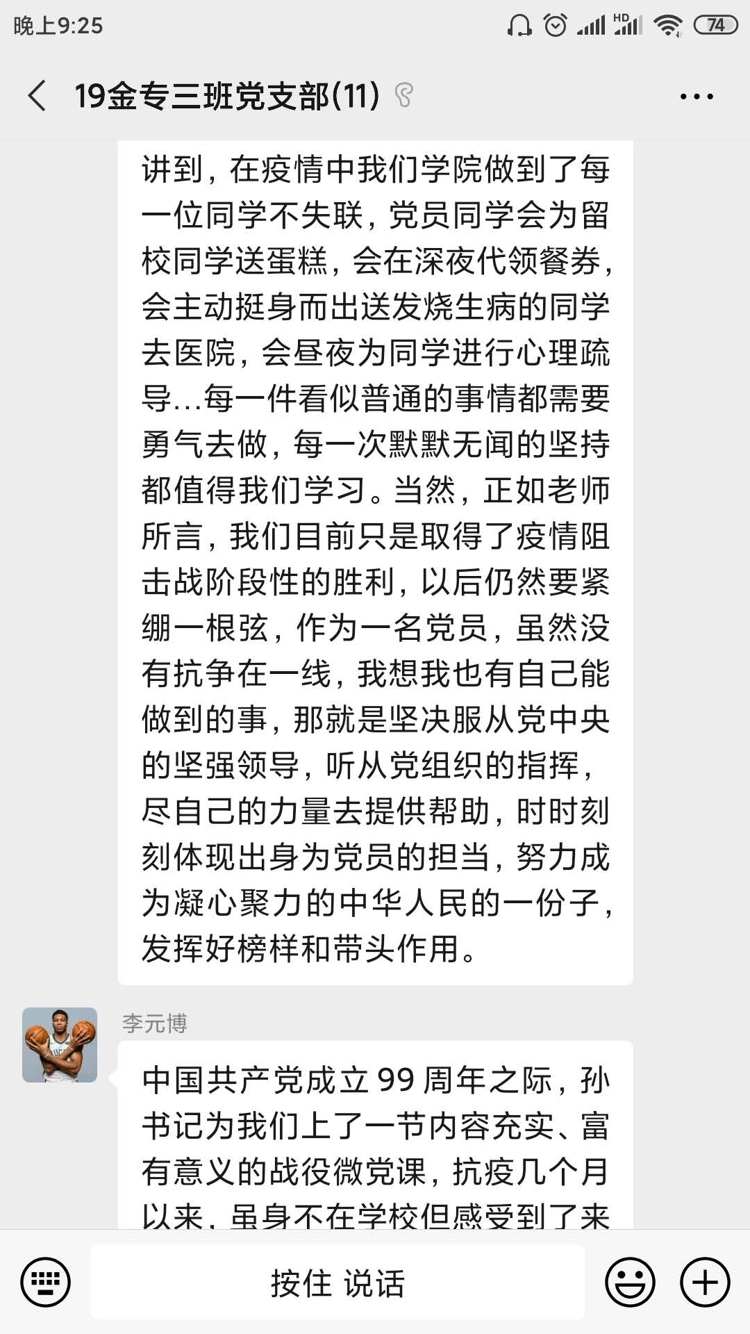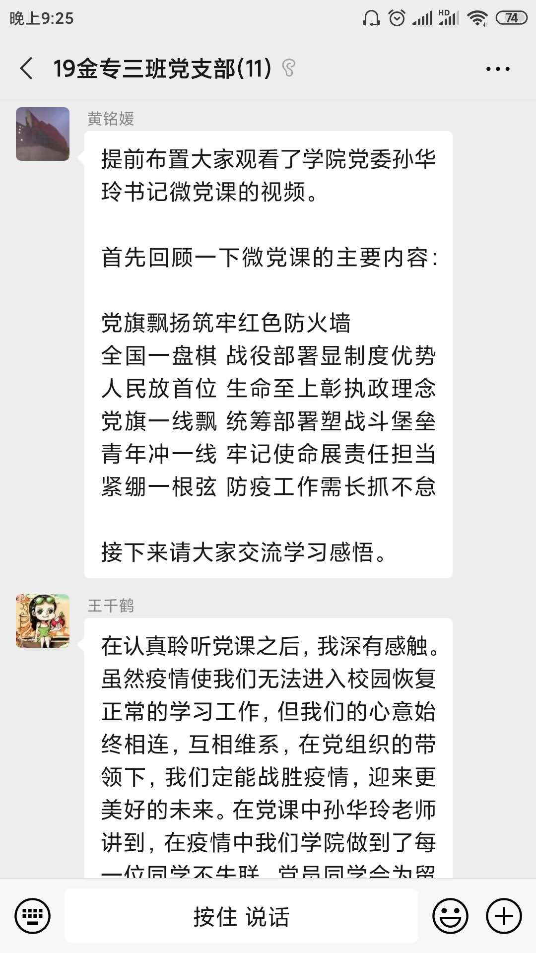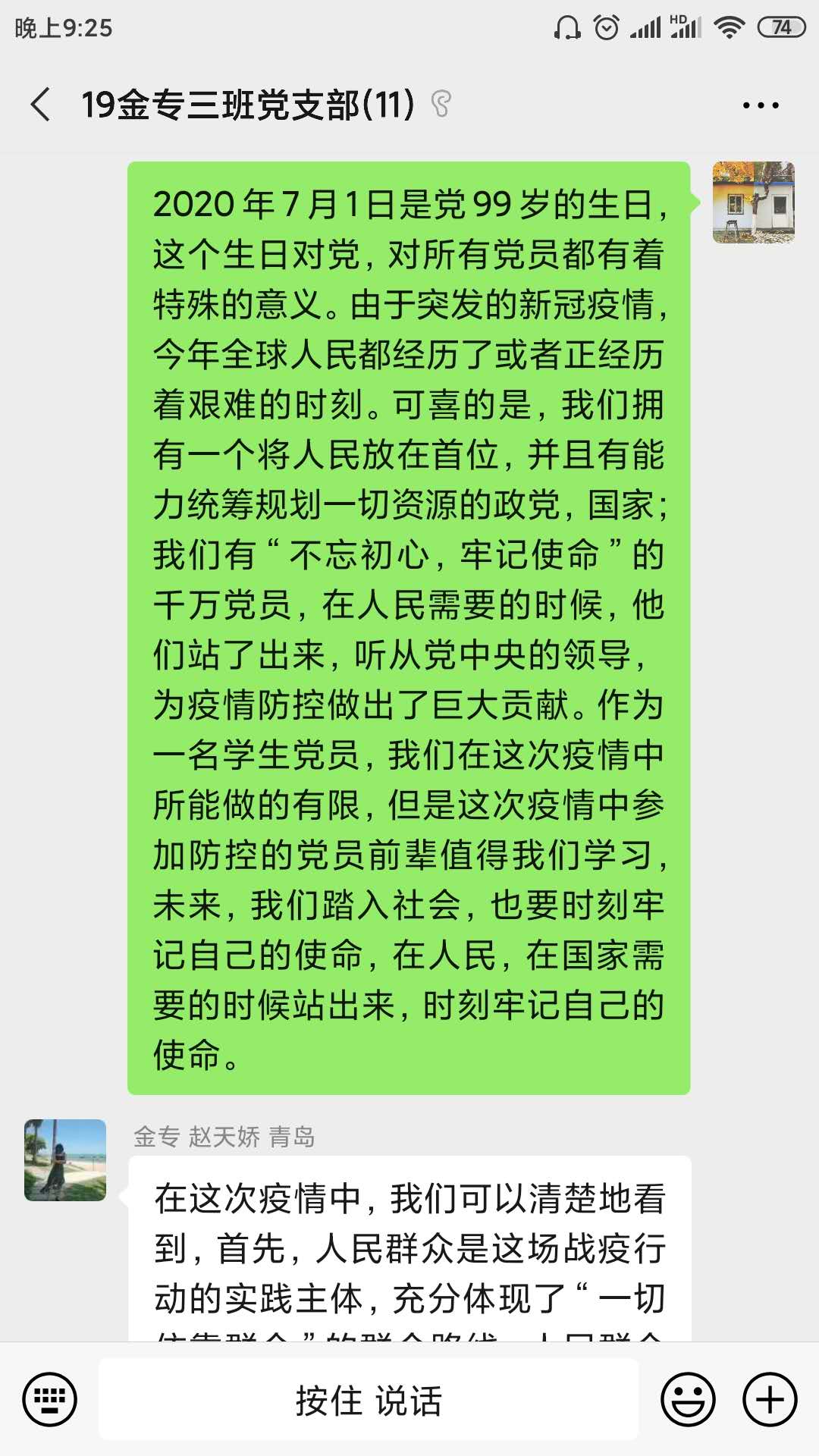2020年7月1日是党的99岁生日,公司党委书记孙华玲老师为大家录制了以“党旗飘扬筑牢红色防火墙”为主题的微党课,本次主题党日活动将孙老师的微党课作为学习材料,支部各位成员先自行观看微党课,再集中讨论交流。晚上7点,支部成员准时上线,分享自己的学习心得。2020年年初,新冠肺炎疫情爆发,在这次疫情攻坚战中,党和国家时刻将人民放在第一位,以人民的生命安全为首要任务。同时,党中央坚持走群众路线的优势也在此时尽显,正是因为时刻谨记“为了人民”,才能在关键时刻“依靠人民”,在全国人民的努力下,抗疫战争取得了阶段性的胜利。在因为疫情无法返校的半年时间里,财金公司通过各种方式保证所有师生正常的工作、学习,用线上活动的方式让党员同志能紧紧围绕在党组织身边。
