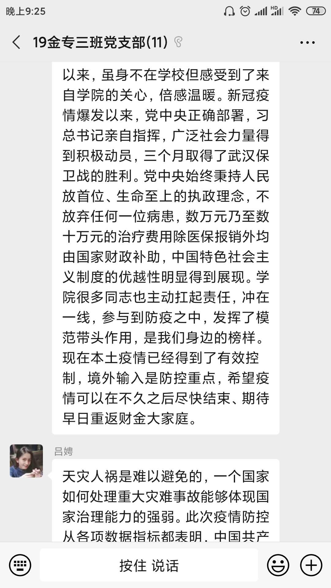 这次主题党日活动让支部成员们感触良多,一方面,我国在抗疫战争中取得的阶段性胜利让大家感到由衷的喜悦,但另一方面,我们距离最终的胜利还有一段距离,大家表示会听从组织安排,积极与疫情抗争,静待抗疫战争最后的胜利,同时不断提升自己,为未来成为党的可靠的后备力量而努力。