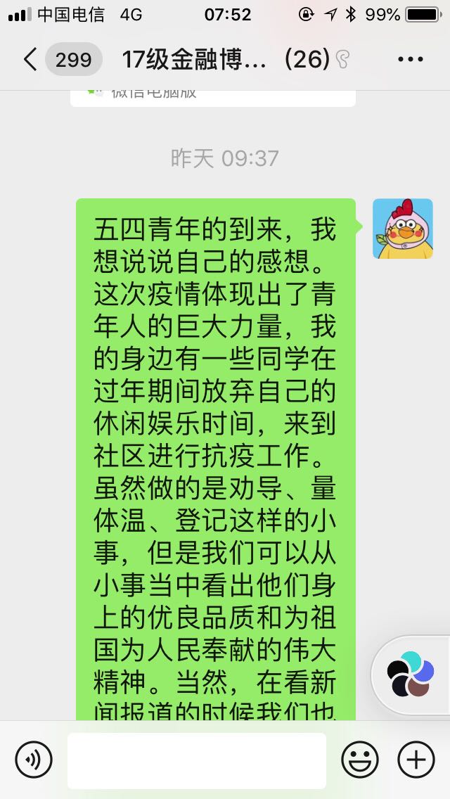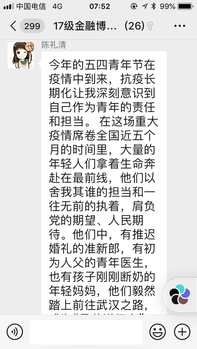 2020年5月10日,公司2017级金融博士党支部开展了“弘扬五四精神”线上主题党日活动。活动通过微信群讨论形式展开,由全体党员通过学习习总书记对时代青年的寄语,之后以文字形式分享自己的学习感想。