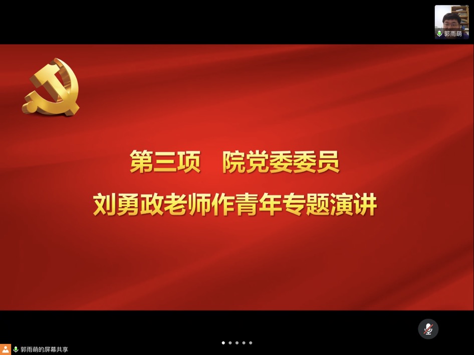 紧接着刘勇政老师向支部同志们讲青年专题党课。刘老师提到,忧国忧民、热爱祖国、积极创新是五四运动的核心精神。他勉励各位博士生党员应该拥有创新探索精神,做好本职研究工作,珍惜学习机会,珍惜易逝韶华,用奋斗的青春谱写无悔的篇章。在这次抗疫战斗中,许许多多的青年医务工作者们冲锋在前,真情奉献,他们用行动证明了新时代青年勇担重任的风采。担当责任无所谓大小,毋以善小而不为,要拥有底线思维。作为子女,应当孝顺父母;作为员工,应当认真听好每堂课,扎实基础潜心科研。只有从小处着手,才能人性化地去担当起社会责任。
