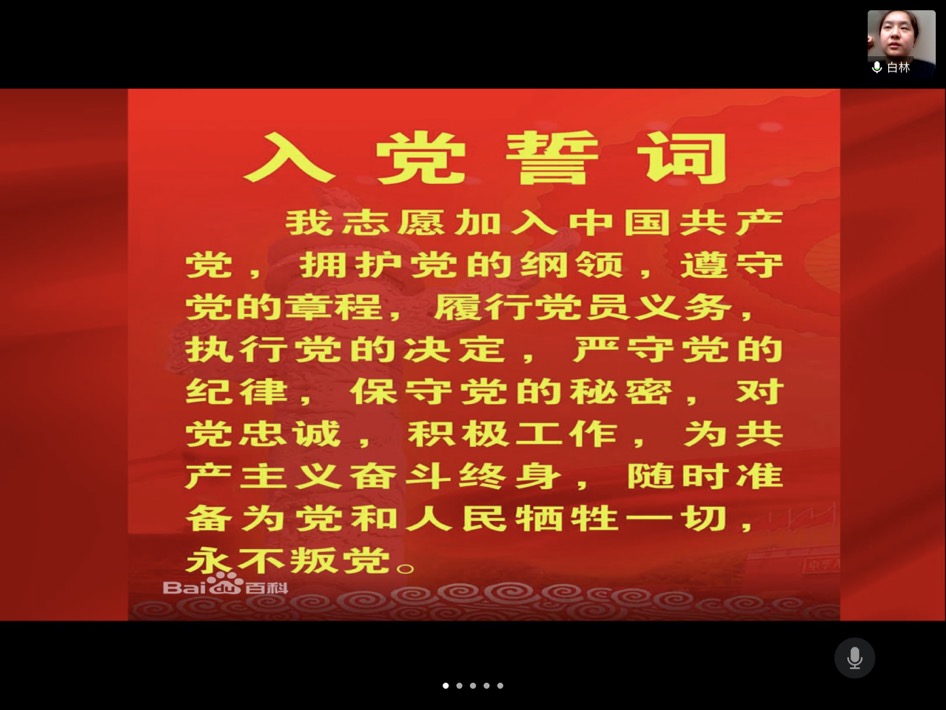 会议第一项奏唱国歌,第二项重温入党誓词。在郭雨萌书记的带领下,全体与会党员庄严宣誓。仍记得当初无比激动地在党旗下许下的誓言,成为一名共产党员。此刻重温入党誓词,支部成员们更加坚定为共产主义奋斗终身的伟大使命。