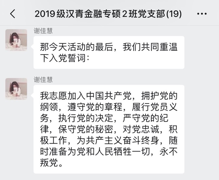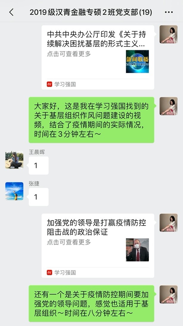 线上主题党日 | 2019级汉青金融专硕二班党支部观看教育视频,分享先进事迹