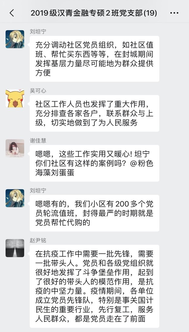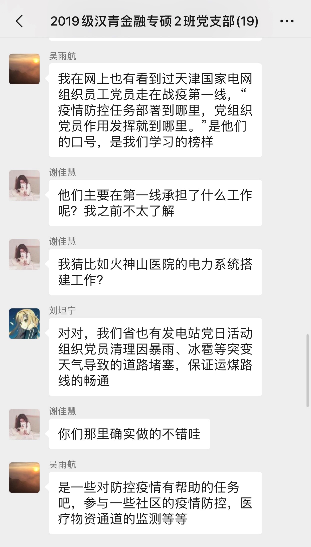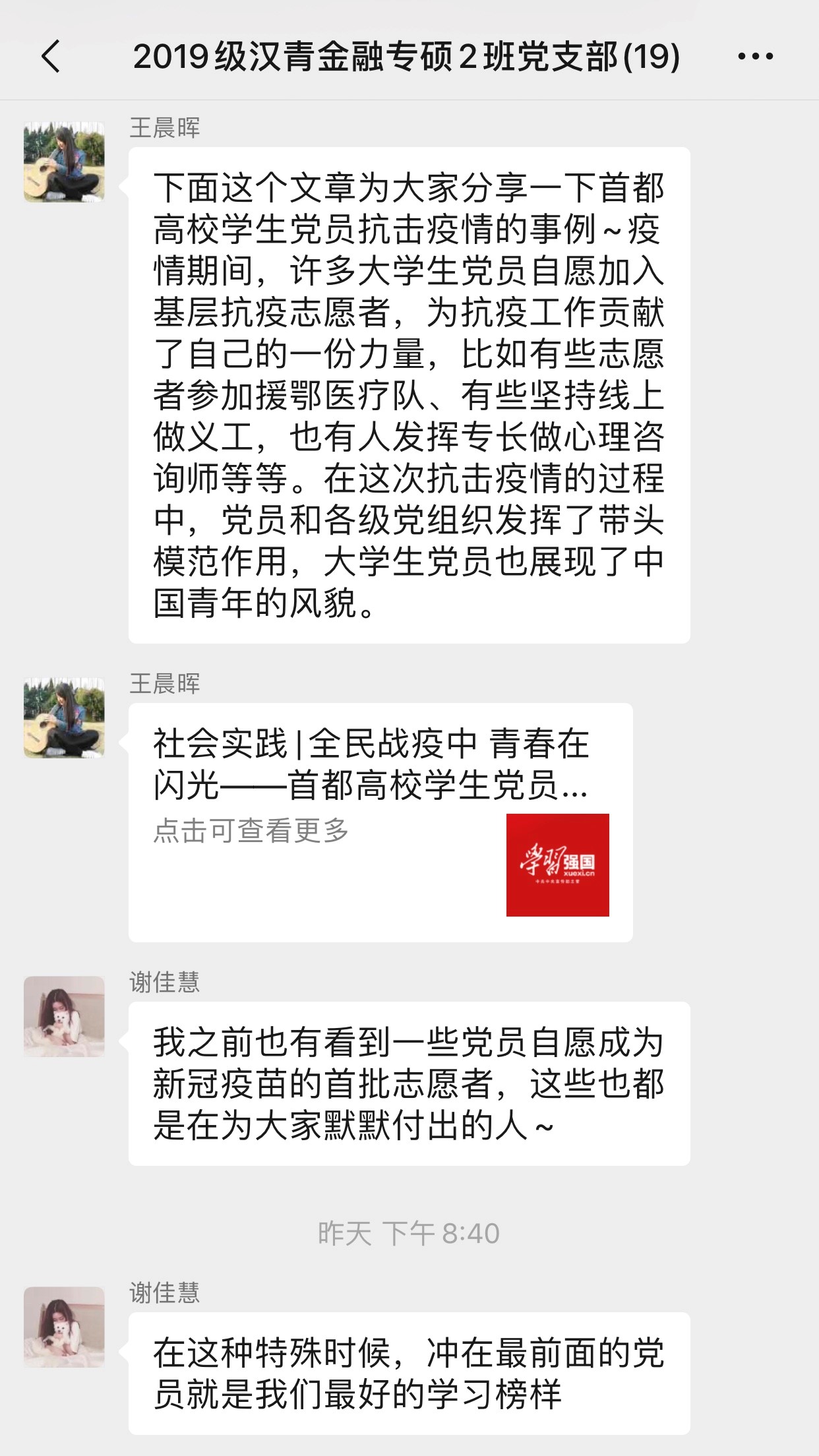 接下来,支部成员们在微信群中分享了疫情期间身边党员同志的先锋模范事例。王晨晖同学分享了一个首都高校员工党员抗击疫情的事例。疫情期间,许多老员工党员自愿加入基层抗疫志愿者,为抗疫工作贡献了自己的一份力量。有些志愿者参加援鄂医疗队、有些坚持线上做义工,也有人发挥专长做心理咨询师等等。他表示,在这次抗击疫情的过程中,党员和各级党组织充分发挥了带头模范作用,老员工党员也展现了中国青年的精神风貌。谢佳慧同学提到有一批党员自愿成为新冠疫苗的首批志愿者,她们是为大家默默付出的人,是逆行者,也是值得我们学习的榜样。这些榜样的存在,为我们的前行提供了方向。