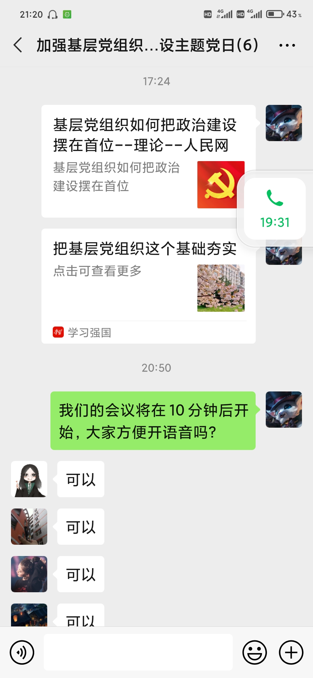 为更好地发挥基层党组织战斗堡垒作用,增强党组织凝聚力,2019汉青学硕党支部于2020年4月17日在线上开展了以“加强基层党组织政治建设”为主题的党日活动。本次活动由支部书记周柯宇主持,支部全体党员以及入党积极分子蒋妲妍参与了此次学习活动并进行了分享交流。