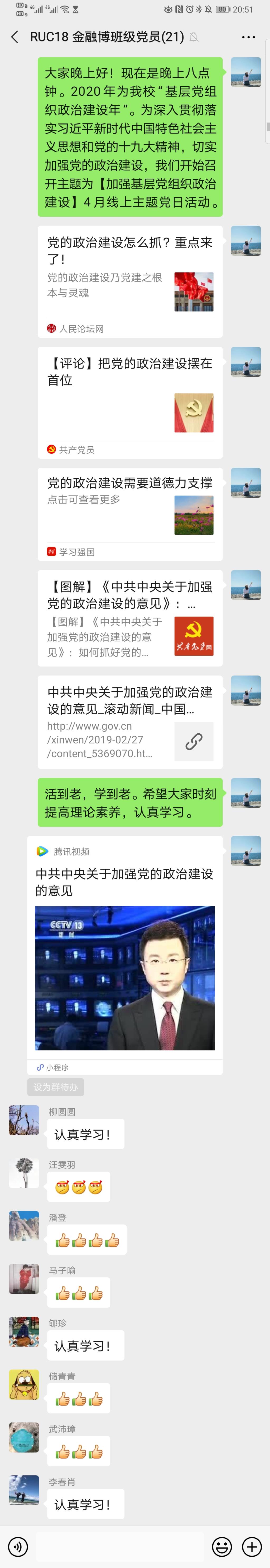 2020年4月17日晚,304永利集团2018级金融博士党支部举办了“加强基层党组织政治建设”主题党日活动。受到疫情的影响,这次的主题党日活动通过微信群以线上活动的方式进行,活动以线上集体讨论、线上知识竞赛等形式进行,来自304永利集团2018级金融博士党支部的全体党员参与了这次活动。
