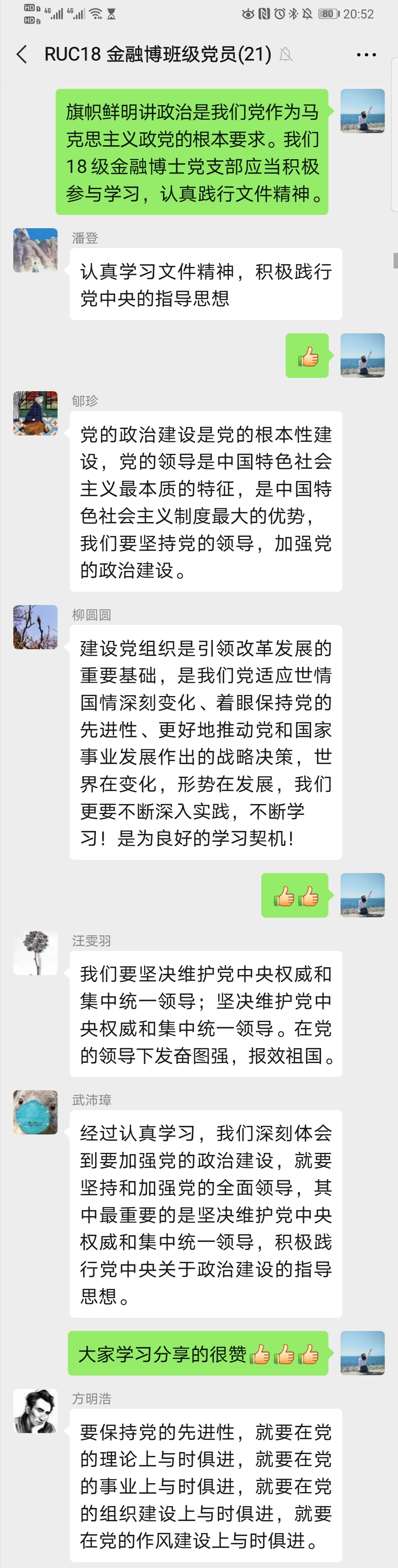 在随后的集体讨论环节,同学们对如何从自身做起加强政治建设、如何将基层党组织加强政治建设的举措落到实处等相关问题进行了热烈的讨论,同学们在微信群内的发言氛围热烈而融洽。