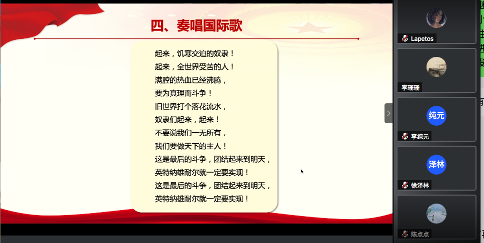 最后,在激昂的《国际歌》歌声中,本次主题党日活动圆满落下帷幕。99年来,中国共产党始终坚持“人民至上”的价值追求和使命担当,克服重重困难,在磨难中成长,带领着国家由弱变强,为百姓创造了更好的生活条件和更高的生活质量。在疫情期间,中国共产党始终将人民的生命安全和身体健康放在第一位,带领全国各族人民团结一心抗击疫情,创造了许多奇迹,也涌现了诸多感人事迹。疫情抗击的历程,更加明确了我们要坚持中国共产党的领导,坚持走中国特色的社会主义路线。本次主题党日活动,通过事件梳理、数据解读、故事分享和心得交流,再度激发了与会同志以实现中华民族伟大复兴为己任的志向和信心,不论往后身在何处、身居何职,同志们都不忘自己的初心和使命,乘风破浪、砥砺前行!