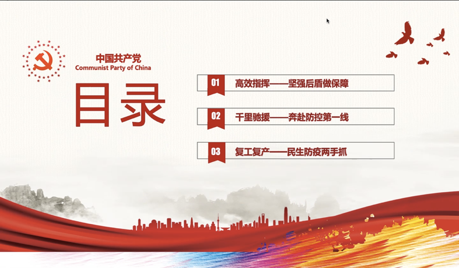会议伊始,刘家琳同志首先从“党旗始终高高飘扬”切入,围绕“把人民群众生命安全和身体健康放在第一位”的主题,为与会同志讲授了一堂专题微党课。本次微党课主要包括三方面内容,一是“高效指挥-坚强后盾做保障”;二是“千里驰援-奔赴防控第一线”;三是“复工复产-民生防疫两手抓”。