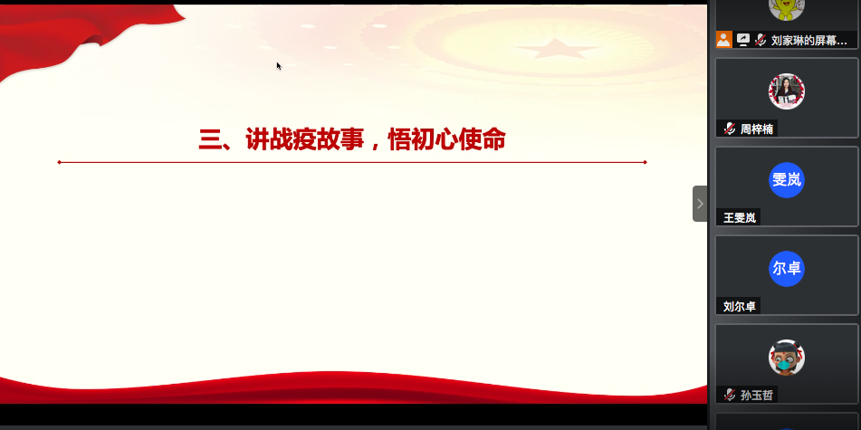 一堂声情并茂的微党课,让支部成员感受到党旗在防控疫情斗争的第一线高高飘扬,也将与会同志的思绪拉回疫情防控的艰难时刻,回想起广大党员和人民群众在疫情防控斗争中践行初心使命的生动事迹。微党课结束后,各位党员和积极分子踊跃分享了身边的战疫故事和切身体会。