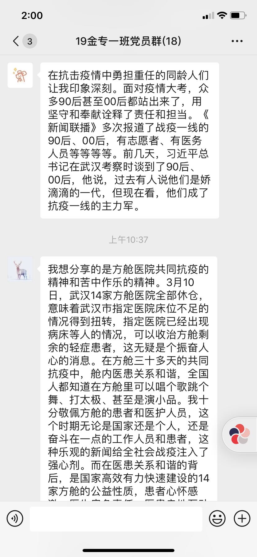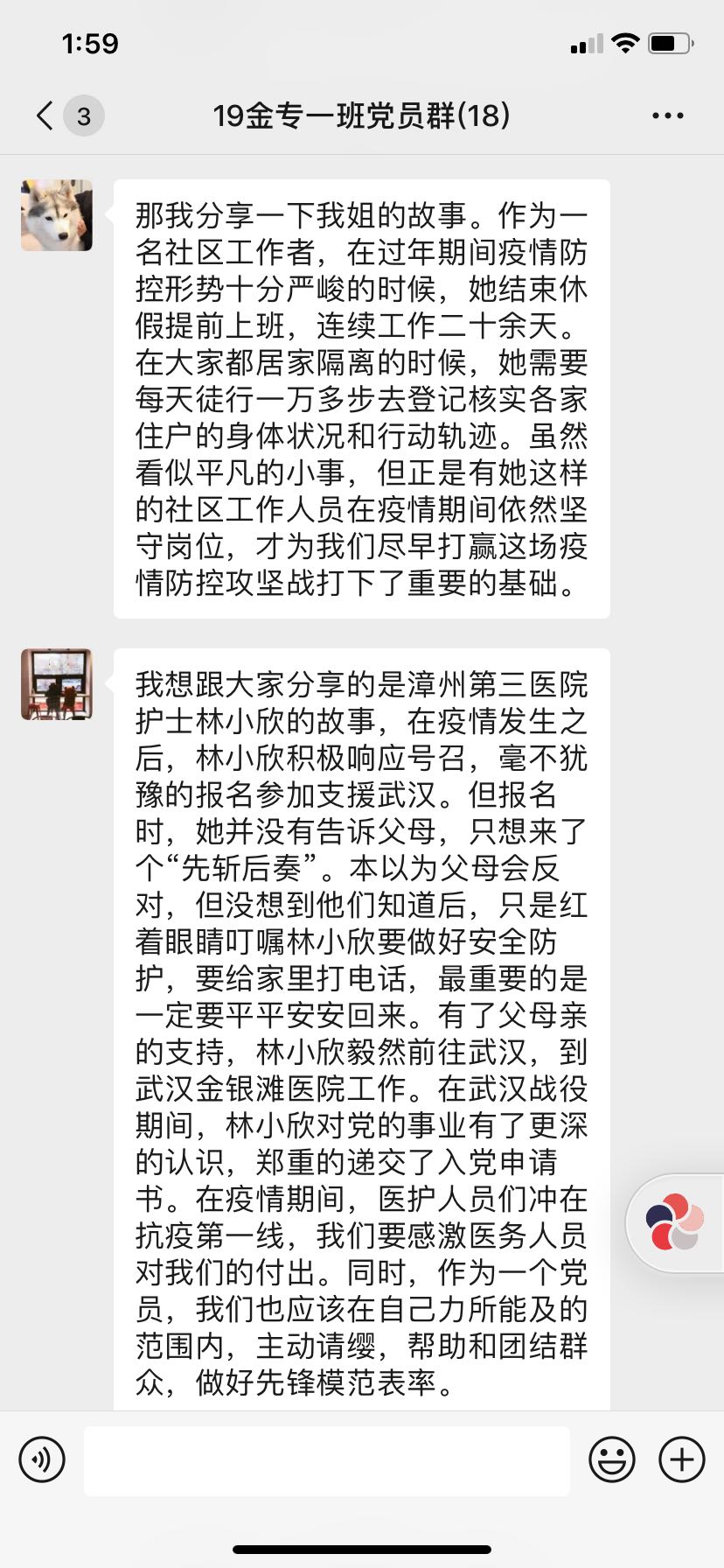 为更好地学习疫情防控相关知识,发挥基层党组织战斗堡垒作用,2019级金融专硕一班党支部于2020年3月14日晚在支部微信群开展“画好共同抗疫情的同心圆”三月线上主题党日活动。此次活动中大家结合身边抗击疫情的故事,分享了抗疫心得体会,从而更好地发挥党员先锋模范作用。